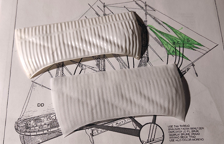 Eine feinmaschige Bluse und mit Wasser verdünnter Holzleim geben - auf die Alten Segel als Schablone gelegt - mithilfe von einem Bisschen Unterdruck - eine zufriedenstellende und stabile Struktur wieder.