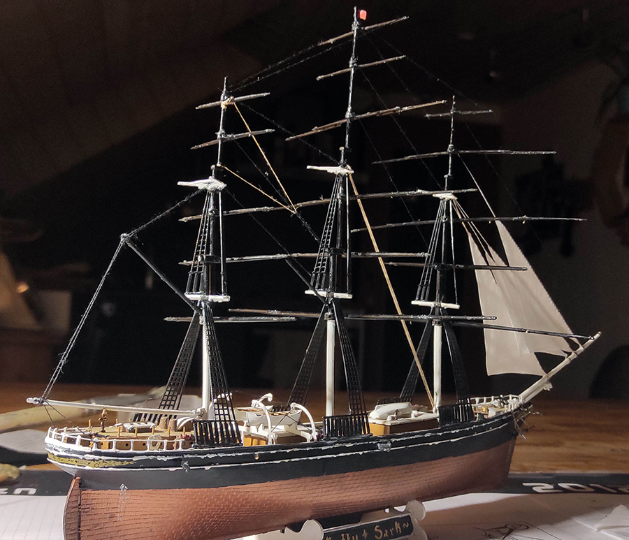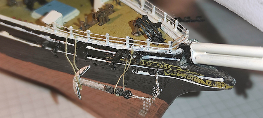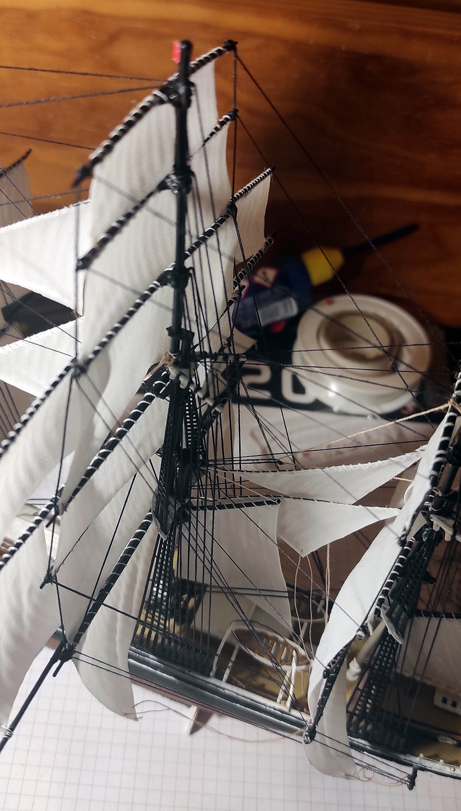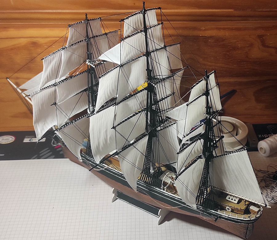 Die Takelage und das stehende Gut nehmen Gestalt an. Ich verwende schwarzes Garn in verschiedenen Stärken und ziehe es vor der Verarbeitung durch einen Block aus Bienenwachs. Dadurch wird es angenehmer zu verarbeiten und fusselt nicht so stark.