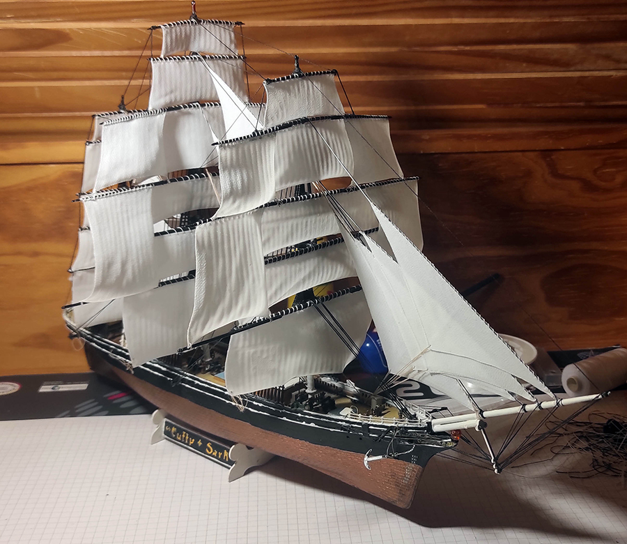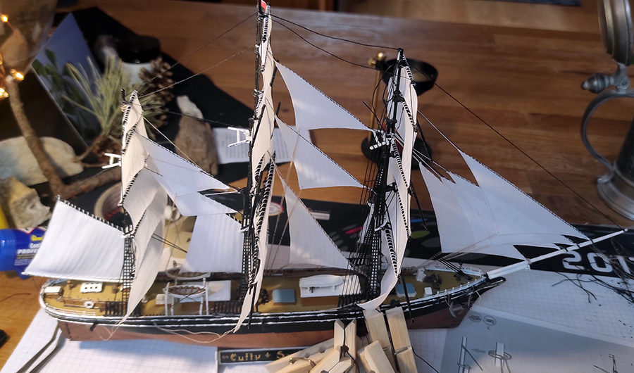 Die alten Segel habe ich beim Aufbau anno ~2006 nicht lackiert, was ohne die schützende Versiegelung und daraus resultierendes Ausdünsten der Weichmacher zu einer äußerst spröden, rissigen Takelage geführt hat.