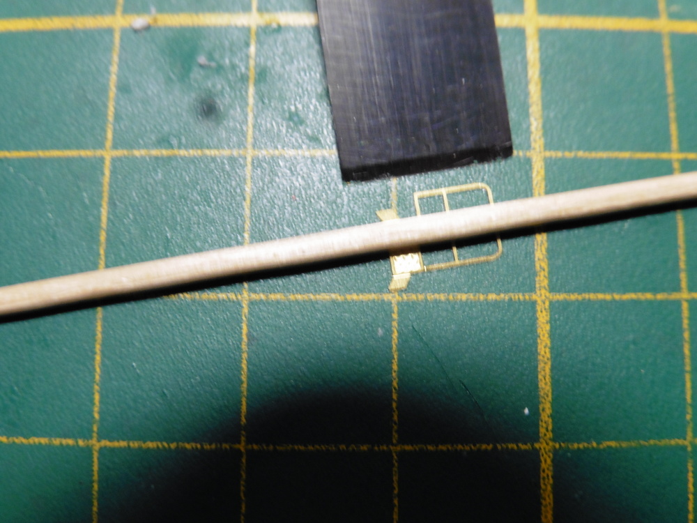 Ich hab das Ätzteil Flach auf eine feste Unterlage gelegt . Dann die Wunderwaffe Zahnstocher auf die gewollte Biegekannte gelegt und mit 2 Fingern fixiert . Dann habe ich meinen Klingenbeitel unter die Reeling geschoben und das ganze dann über den Zahnstocher gebogen . Somit bekommt man eine Rundung in die Reeling . Dann einen Tropfen Kleber unter die Biegekante und die Reeling dann Aufgestellt .