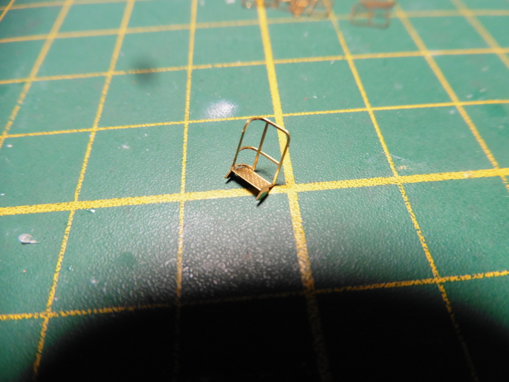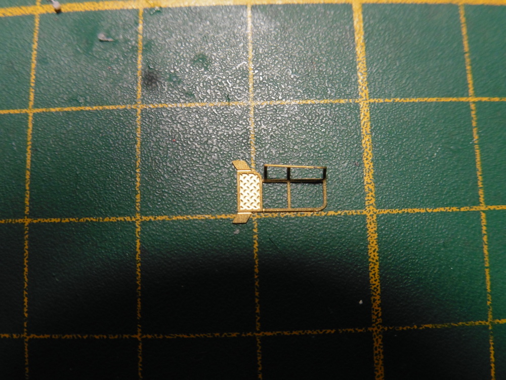 Desweiteren haben wir vorne Rechts und Links eine erhöhte Stellung . Diese wird durch jeweils ein Ätzteil realisiert. Hier ist dann das Schutzgitter / Reeling das schwierigste . Diese muß in einem leichet Bogen gebogen werden. Also kein rechter Winkel. Da die Haltepunkte an der Plattform nur 2 mini Stellen sind ist hier ein Abbrechen ganz schnell möglich . Auch ein zweites Biegen funktioniert nicht . Man hat also nur eine Chance das richtig zu machen .