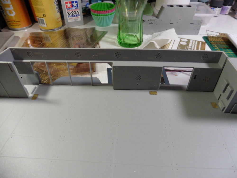 Für einen Überblick hab ich alle Seitenwände aufgestellt . Auch im Innenbereich werden einige Laufgänge Türen etc verbaut. An den Innenwänden sind aber leider einige Auswerfermarken .da mein Schiff offen wird , werde ich diese also alle Spachteln müssen