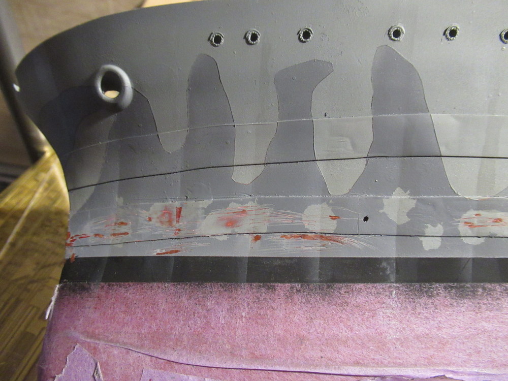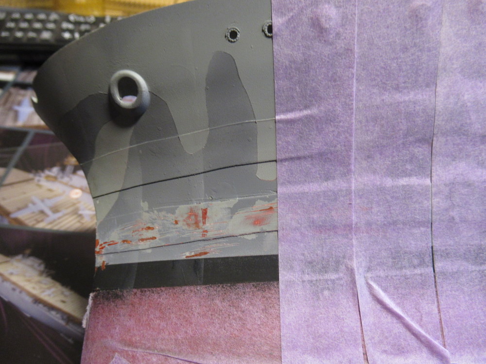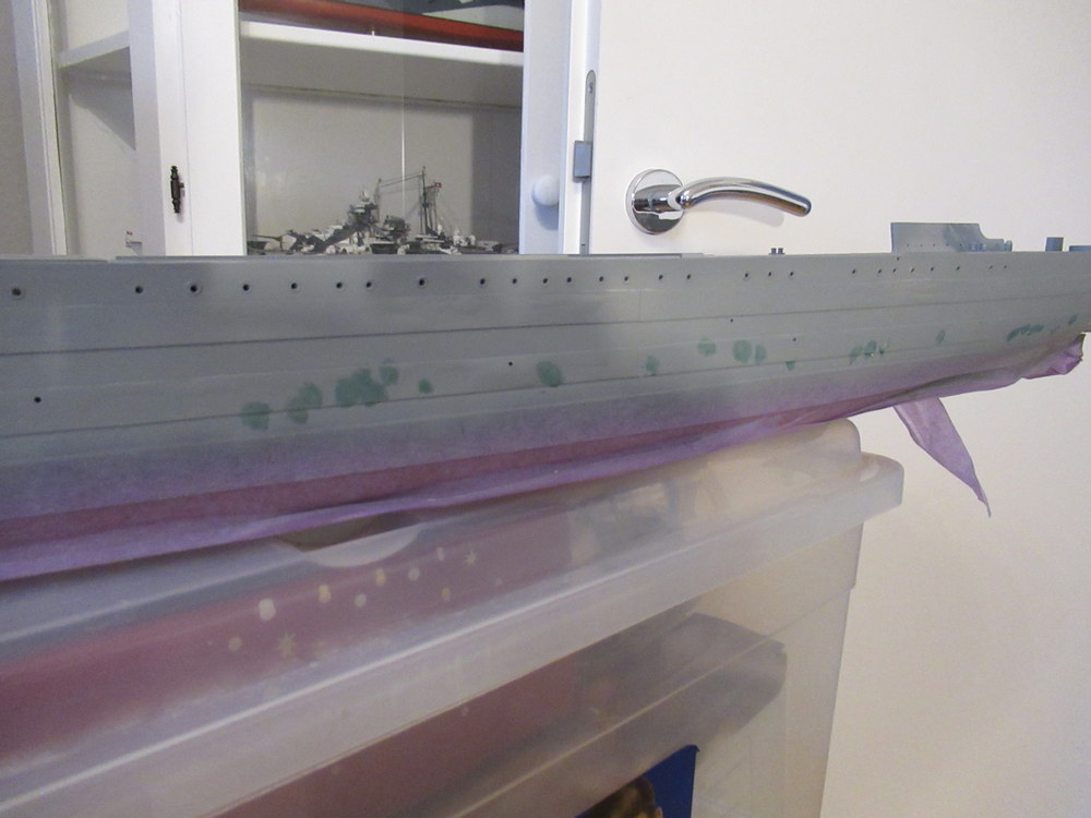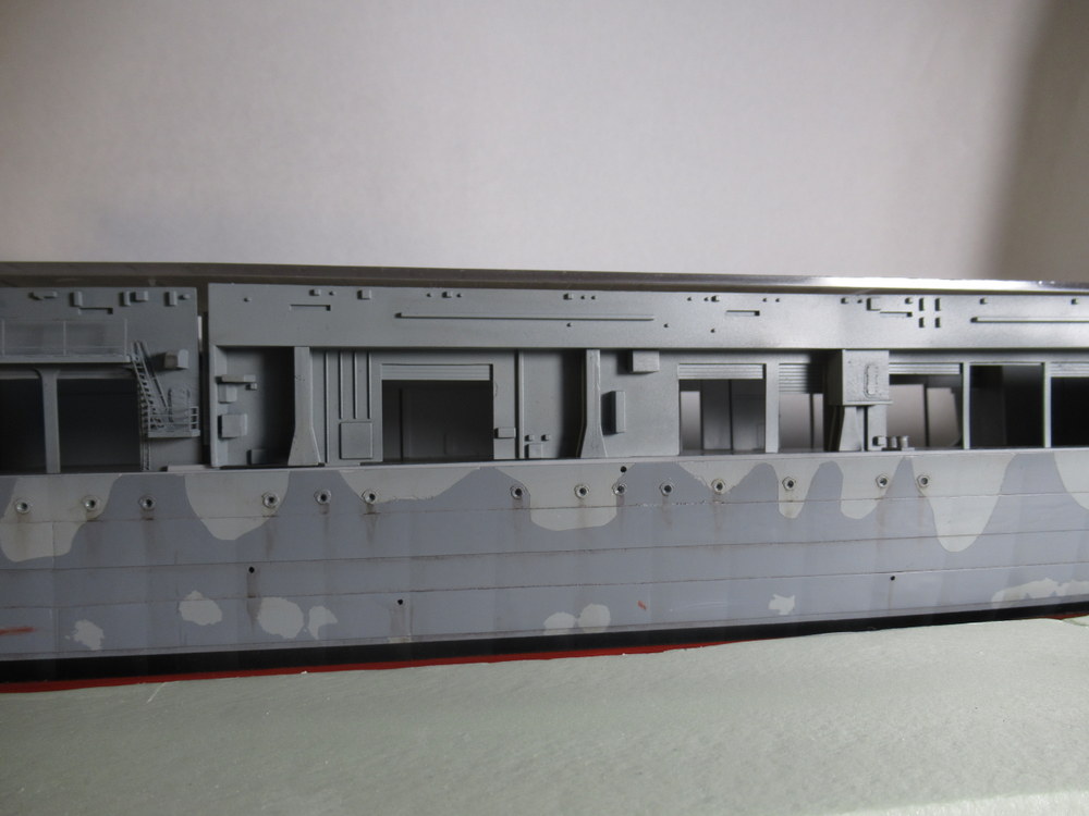 Erst einmal soll auch Rost eine Rolle spielen . Somit wurde auf dem Rumpf an diversen Stellen Rostfarbe aufgetragen . Die Stellen wo er durchschimmern sollte wurde dann mit einem Chipping behandelt . Chippingflüssigkeit wird leicht auf die Stellen aufgetupft . Das Zeug trocknet recht schnell . Dann wird der Rumpf in der Grundfarbe Lackiert . In meinem Fall Hellgrau. Man könnte nun an den Stellen wo das Chipping aufgetragen wurde die Flüssigkeit wieder mit dem Finger oder Pinsel ( Grob) abrubbeln . Dadurch kommt dann der Rost zum Vorschein .
