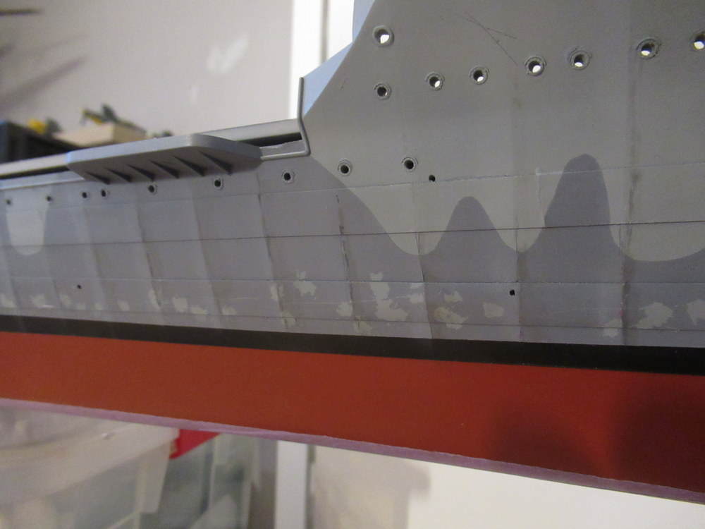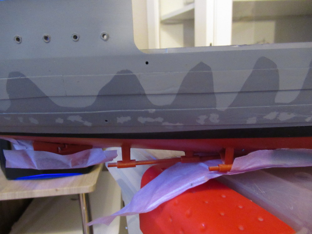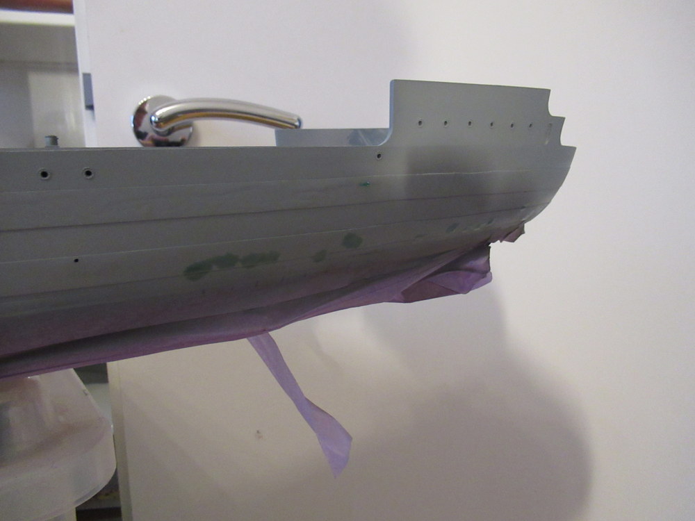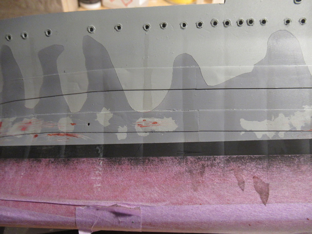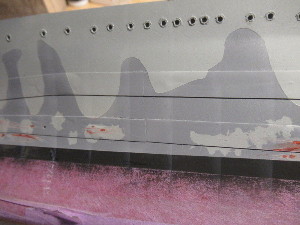 Erst einmal soll auch Rost eine Rolle spielen . Somit wurde auf dem Rumpf an diversen Stellen Rostfarbe aufgetragen . Die Stellen wo er durchschimmern sollte wurde dann mit einem Chipping behandelt . Chippingflüssigkeit wird leicht auf die Stellen aufgetupft . Das Zeug trocknet recht schnell . Dann wird der Rumpf in der Grundfarbe Lackiert . In meinem Fall Hellgrau. Man könnte nun an den Stellen wo das Chipping aufgetragen wurde die Flüssigkeit wieder mit dem Finger oder Pinsel ( Grob) abrubbeln . Dadurch kommt dann der Rost zum Vorschein .