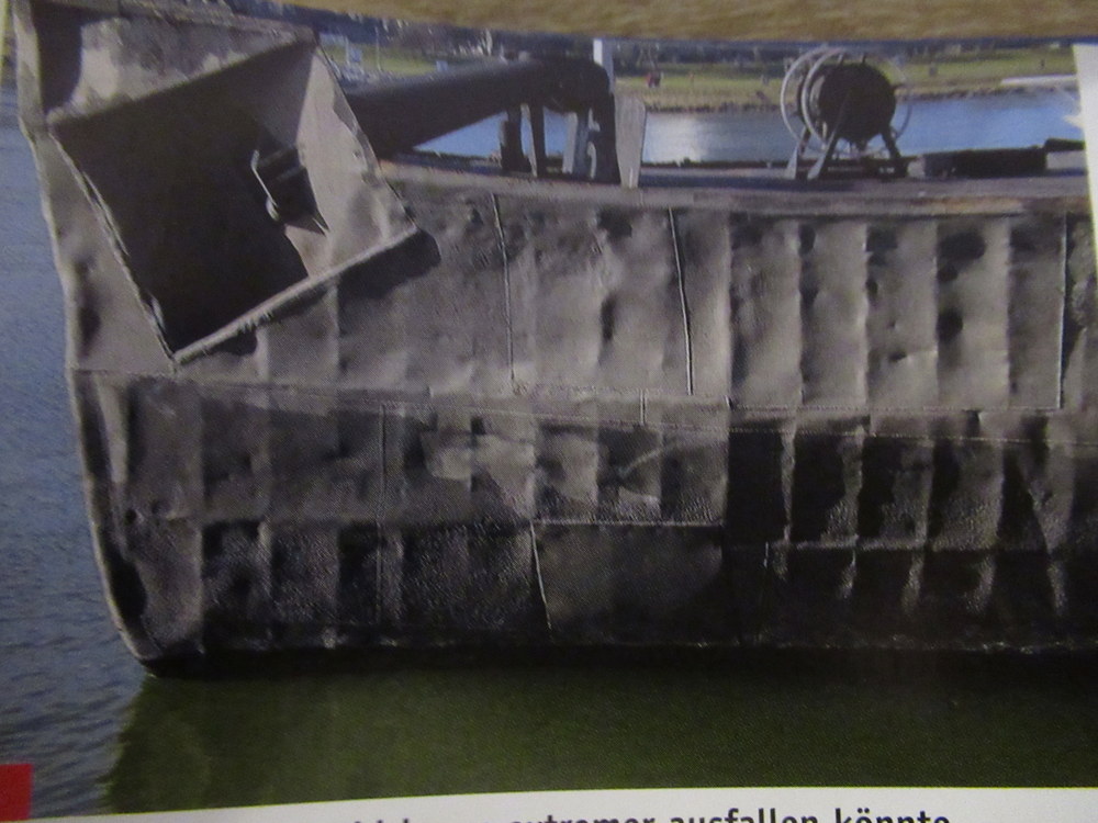 Der Rumpf besteht ja aus waagerechten und senkrechten Streben . Diese drücken sich durch andauernden Wellenschlag langsam durch die Aussenhaut ( Optisch ) Eigendlich sind die Stahlbleche nur eingedellt .