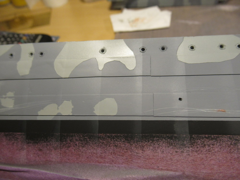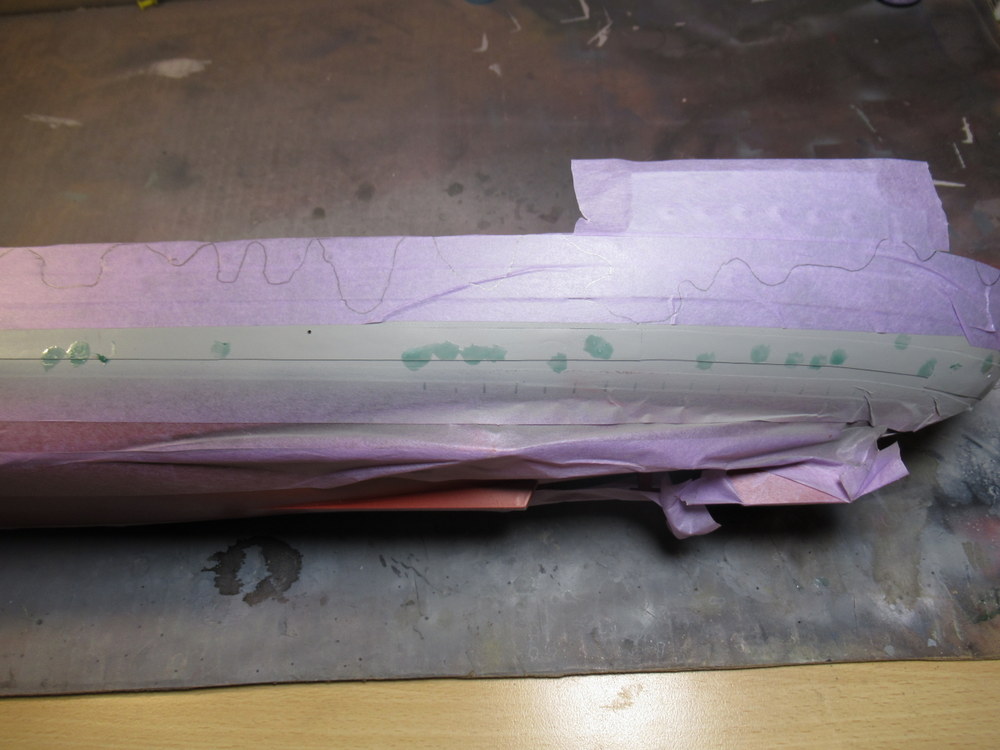 Dieses ist Hellgrau lackiert . Es erfolgt das Abkleben und das Aufzeichen des Tarnanstrichs . Dieses wurde dann mit einem Skalpell ausgeschnitten . Das ganze wird dann in Dunkelgrau Lackiert ( morgen )