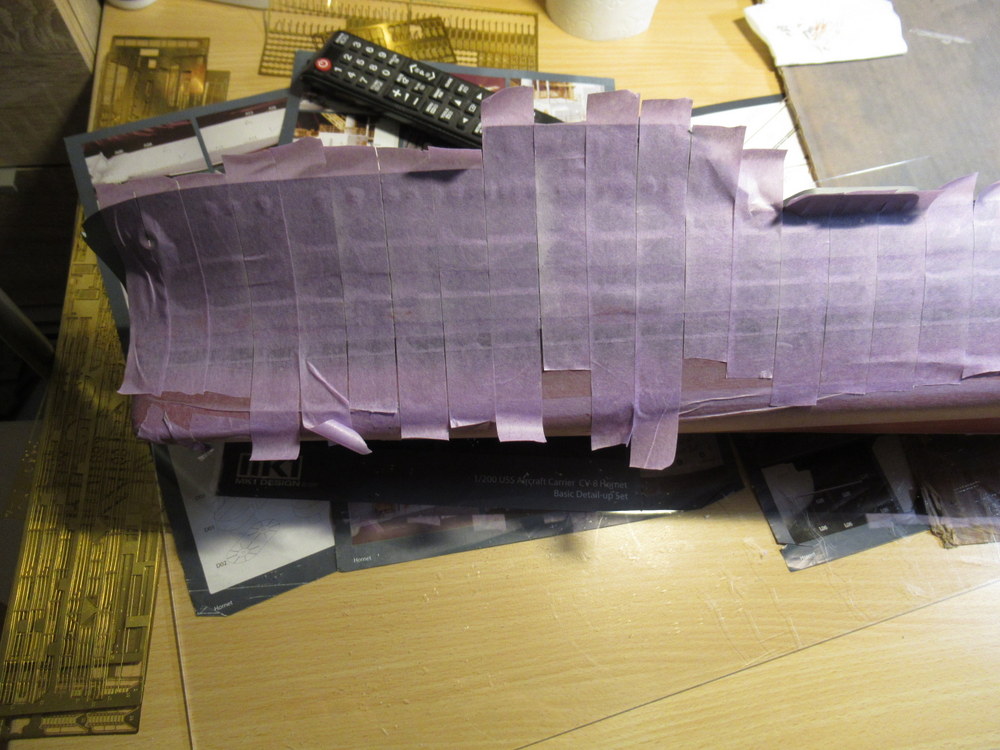 Die Spanten die durchschimmern sollen haben einen gewissen abstand ( je nach Schiff etc. ) Ich habe hier bei meiner Hornet 2 cm gewählt . Ich habe dann auf dem Rumpf einen Senkrechten Strich gezogen und hier das erste Klebeband aufgeklebt . Dieses ist 2 cm breit , somit konnte ich dann 1 Klebeband neben dem anderen aufbringen .