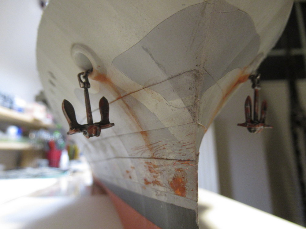 Der von Dir gesehende Rost an den Bulleyes ist kein Rost ... Dieser Effekt entstand durch das Verdrecken des Rumpfes mit einem Dirt Wash was von oben nach unten mit einem groben Pinsel aufgetragen wird. Das ist einfach nur Dreck der durch Regen etc am Schiff herrunter läuft und dementsprechend Spuren hinterläst .