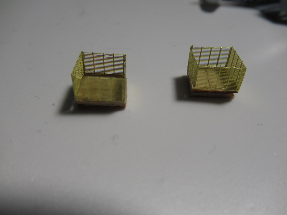 Aus übrigen Ätzteilen und einem Holz- Rührstäbchen hab ich 2 Gitterboxen gebastelt . Grau gebrusht und bestückt .