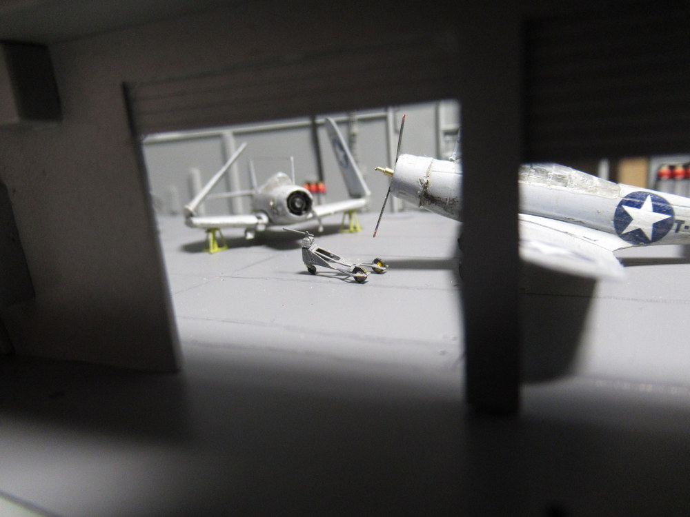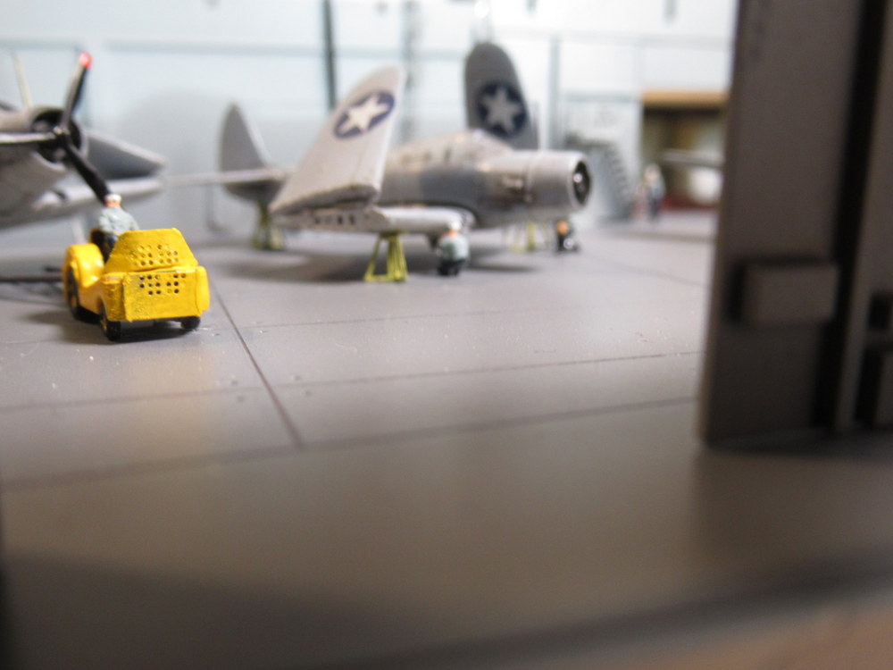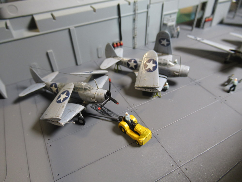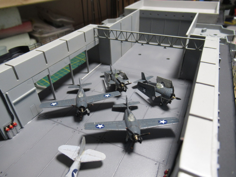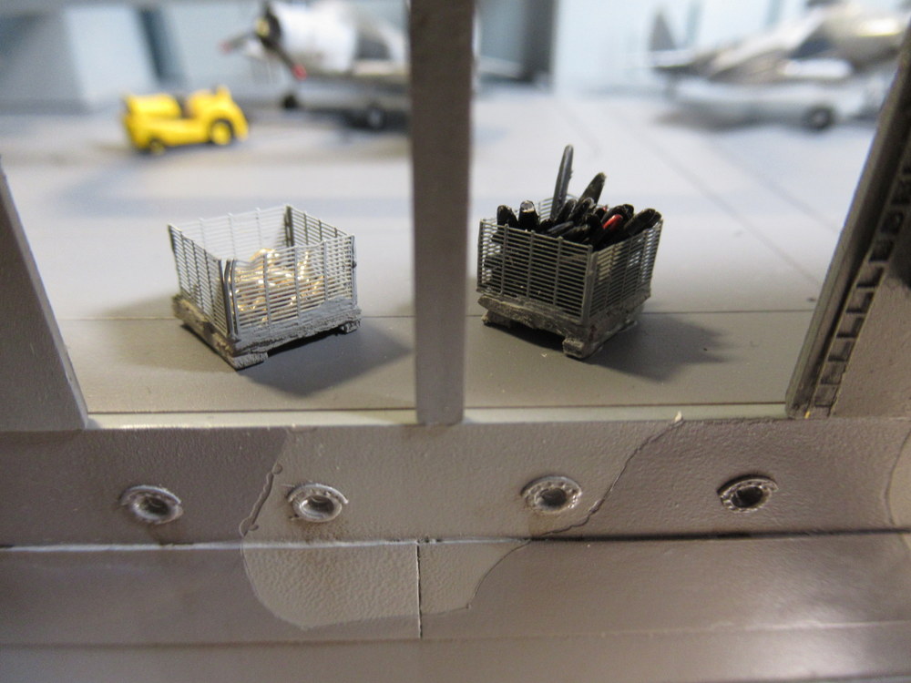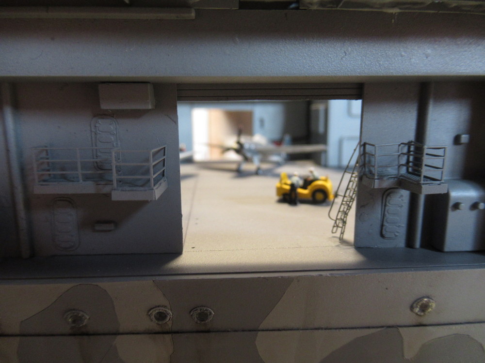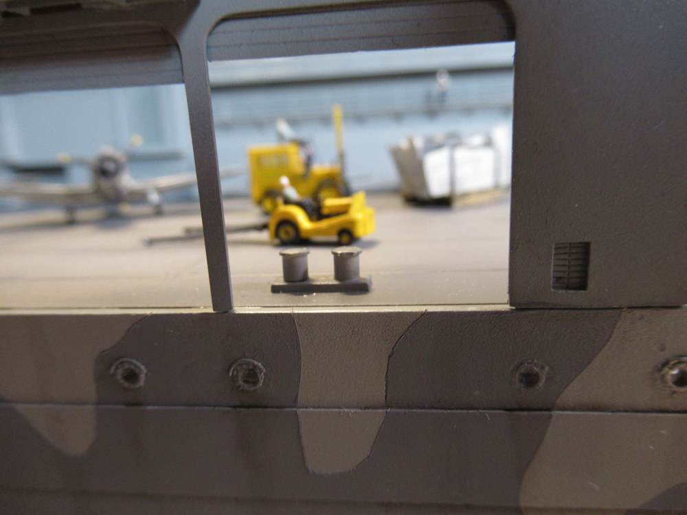 Bei meinem Modell werde ich das aber nicht mehr umsetzen...weil.... Sobald das Deck drauf ist kann man nur noch durch die offenen Rolltore blicken . Die meisten Tore sind aber von aussen auch verstellt mit Booten etc. Somit kann man kaum hinein sehen . Was man dann sieht sind die Flieger etc. Nur durch die Beleuchtung des Decks wird man hier und da einzelheiten erkennen können. Aber auch Abnutzung wird man so nicht sehen können . Daher schenke ich mir das .