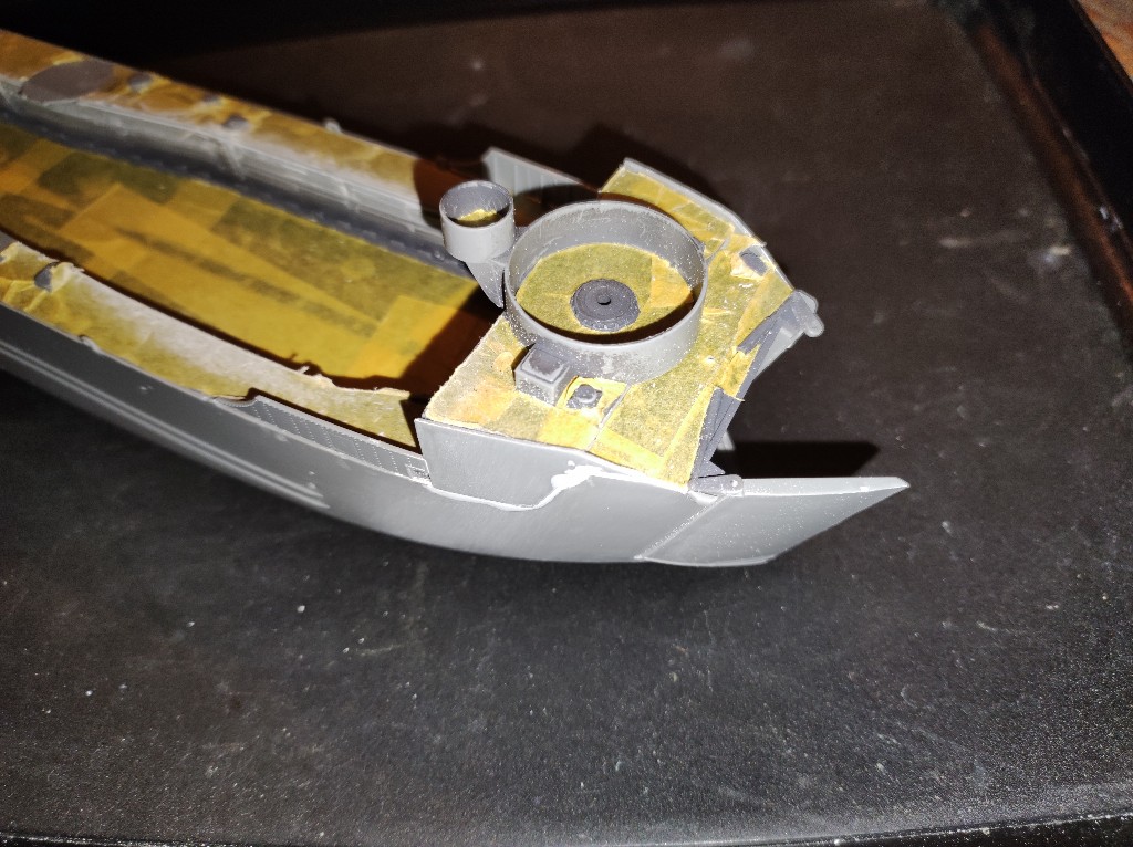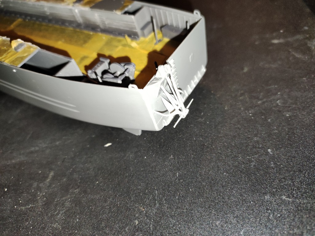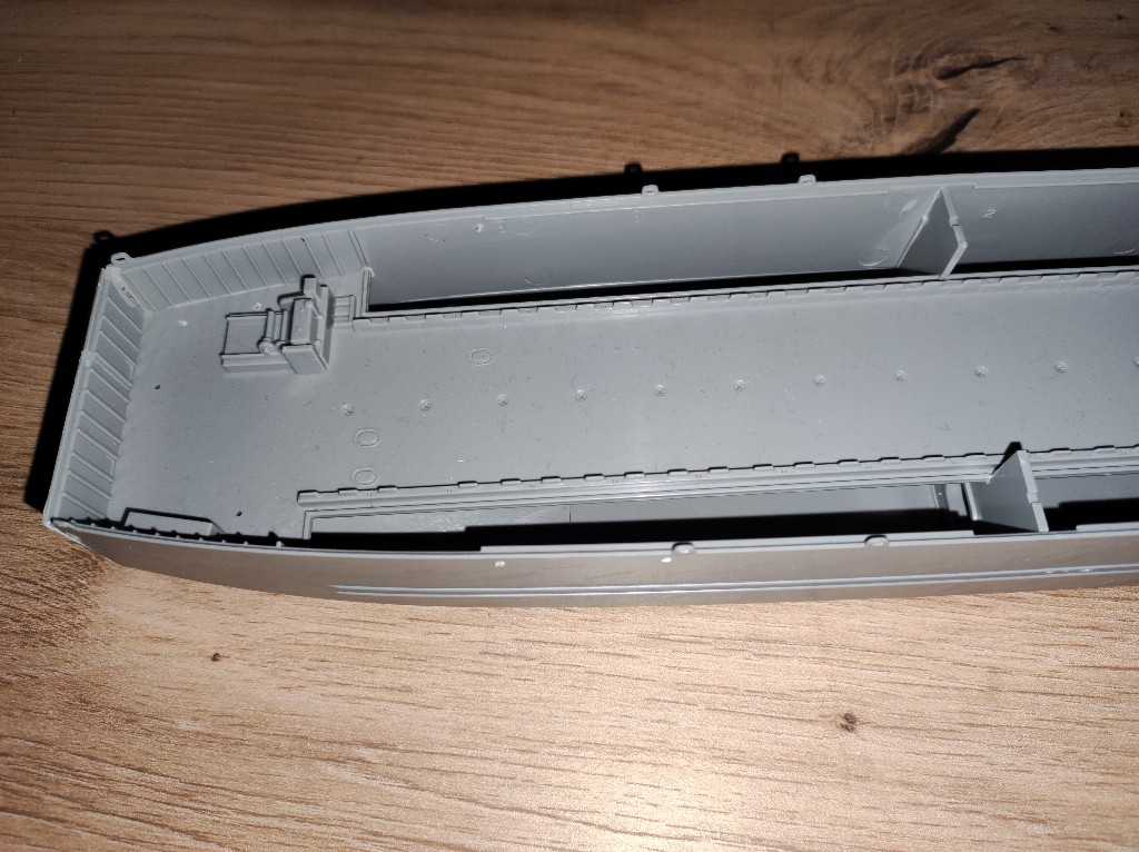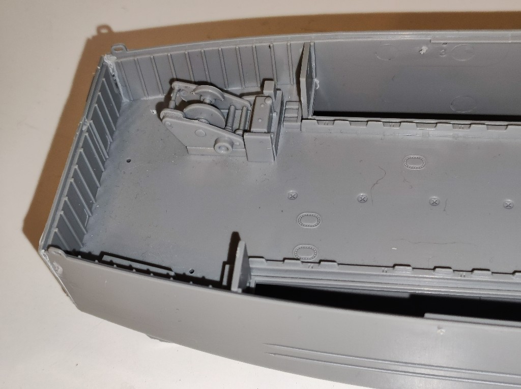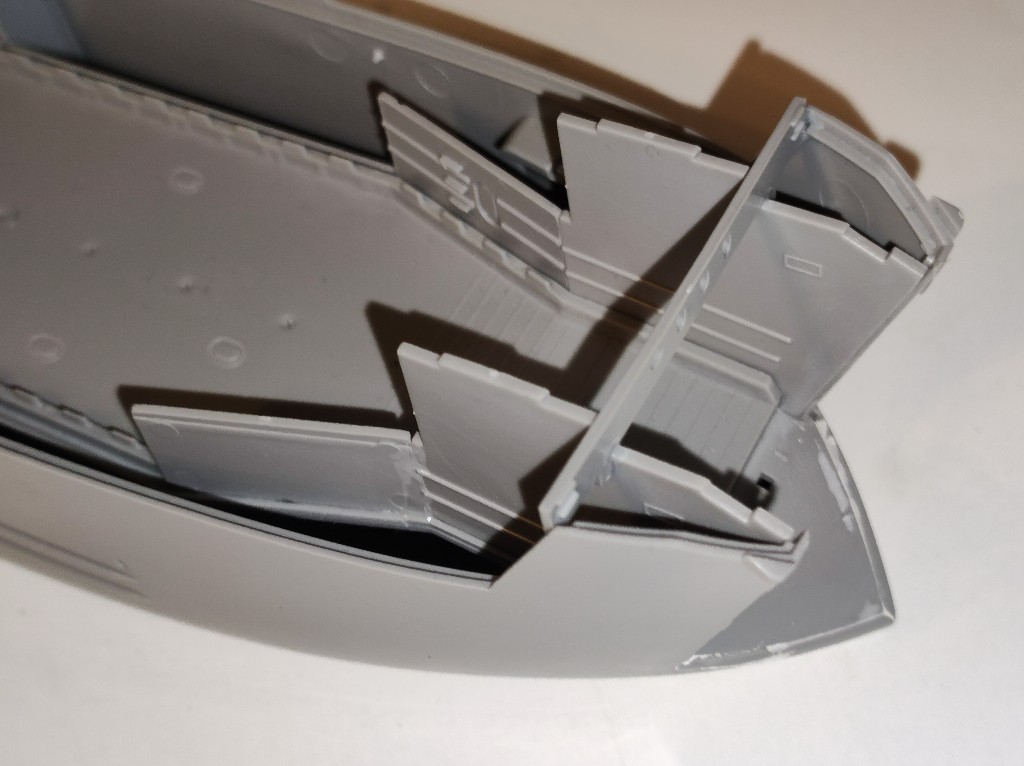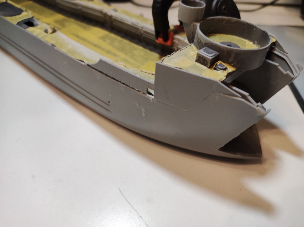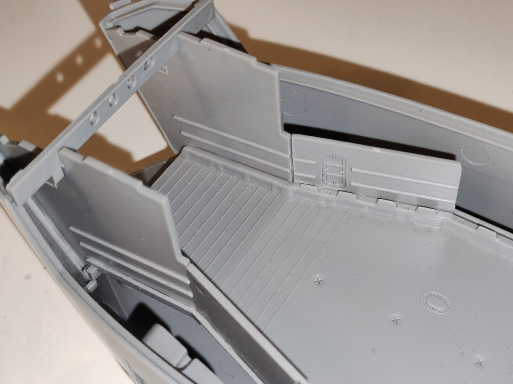 An den Seitenwänden wird nun also auch spachtel nötig sein. Sehr schade, eigentlich dürfte das nicht sein, bei einem so modernen Bausatz. Das Landungsboot ist ja gerade Mal 10 Jahre auf dem Markt.
