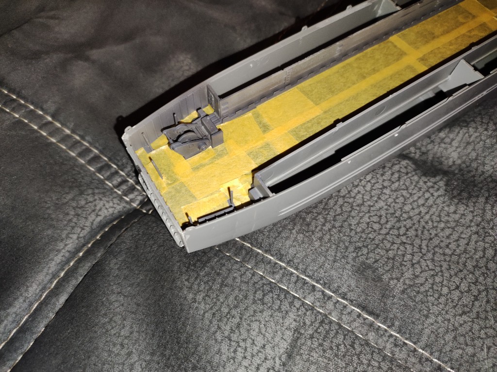 Danach begann die Arbeit und ich habe ich Decks mühevoll abgeklebt, so dass ich nach dem Rohbau bedenkenlos die weiteren Farben sprühen kann. Das war natürlich stellenweise etwas nervenaufreibend, aber ich denke das sollte so funktionieren.