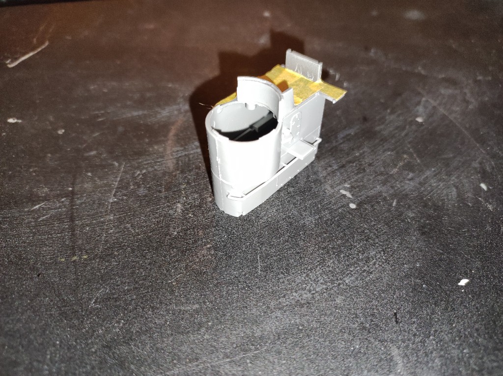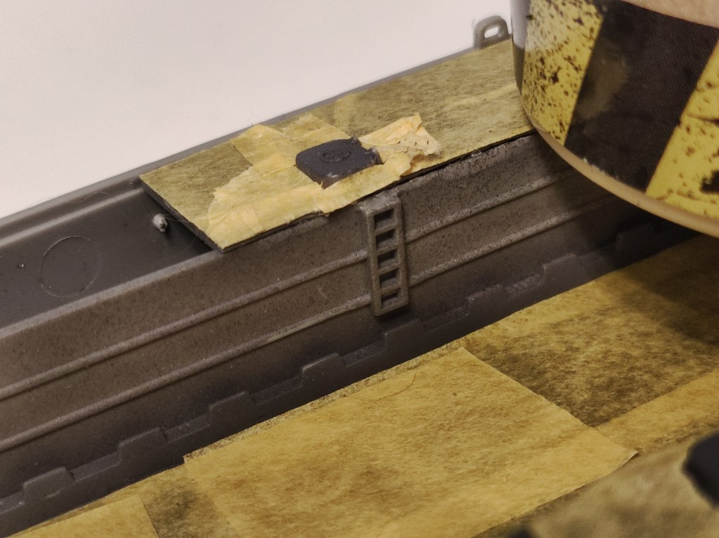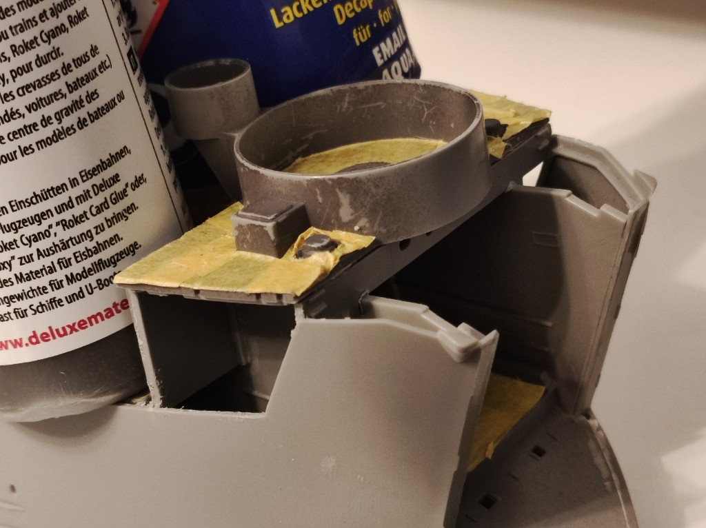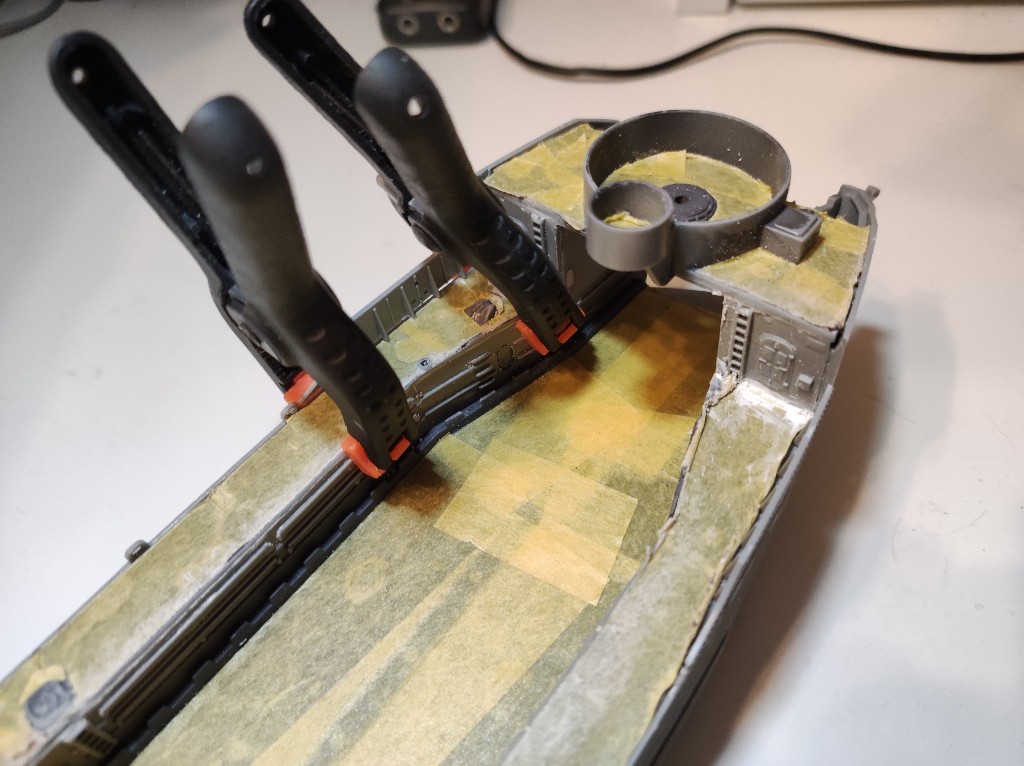 Da die Passung weiterhin miserabel ist und ich mich Frage ob das wirklich so ein Montagsmodell ist oder das ganze verzogen ist. Insbesondere an der Waffenplattform war es grenzwertig. Nun auch die Seitenwände der Aufgänge. Hier habe ich Material entfernt, um dieses Teil vernünftig anzubringen. Wie zu sehen waren hier wieder Klemmen notwendig