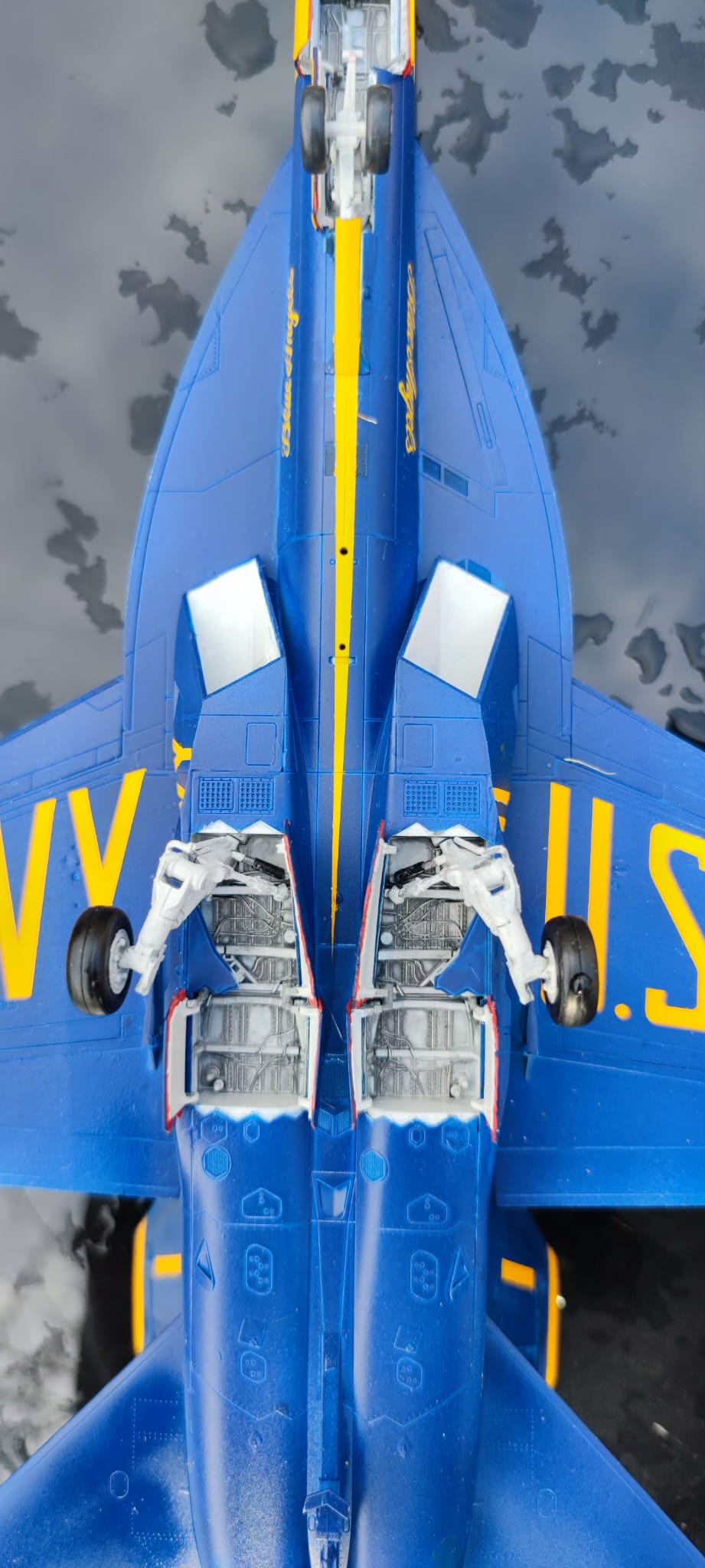 Die "Maverick" ist noch in Arbeit, die Blue Angels dagegen ist fertig. Alles bis auf das Logo und den Blue Angels Schriftzug mit der Airbrush lackiert. Washing im Fahrwerk hat ganz gut geklappt. Auf dem Blau sieht man nix mehr davon. Das war enttäuschend 😞