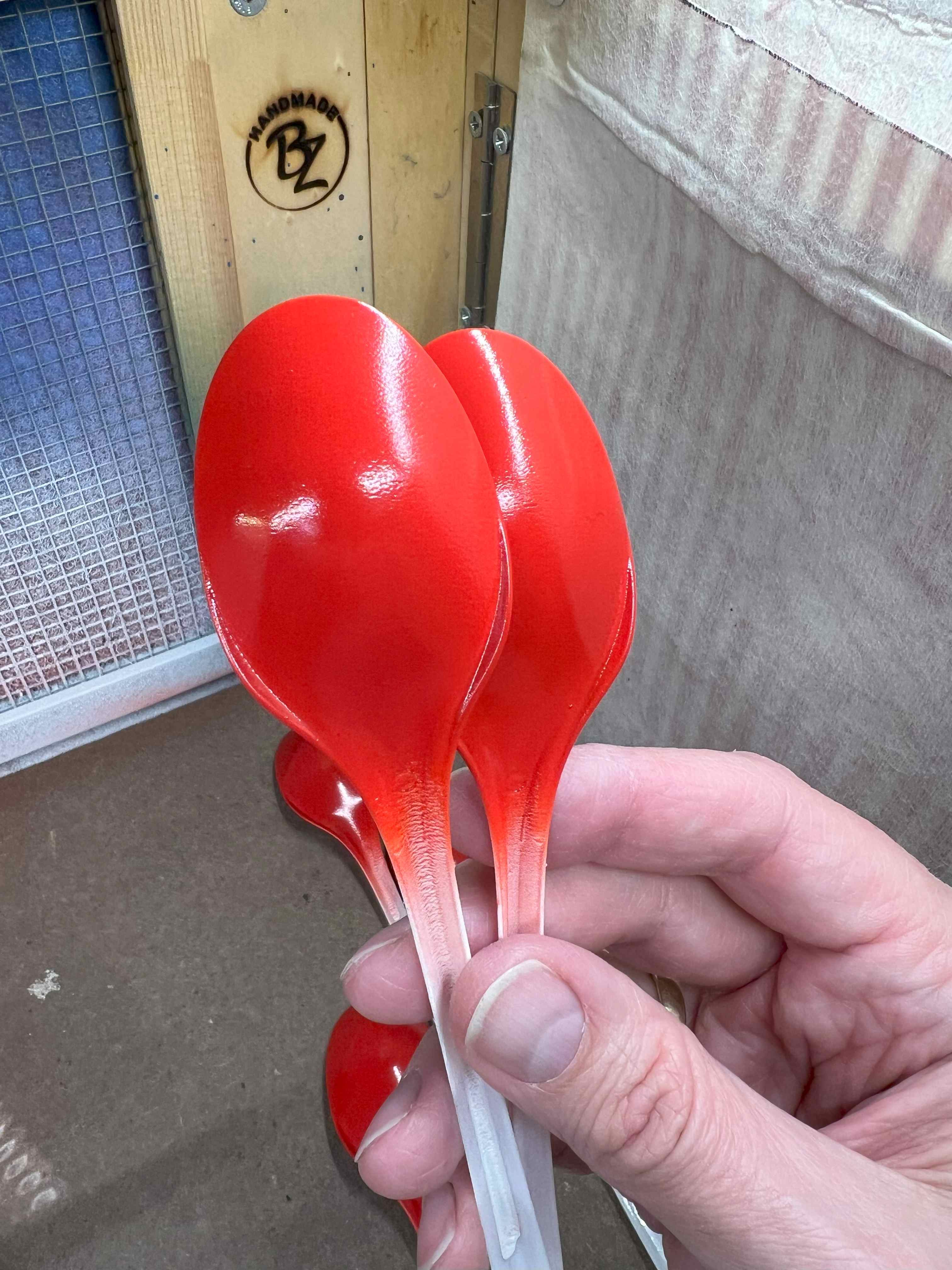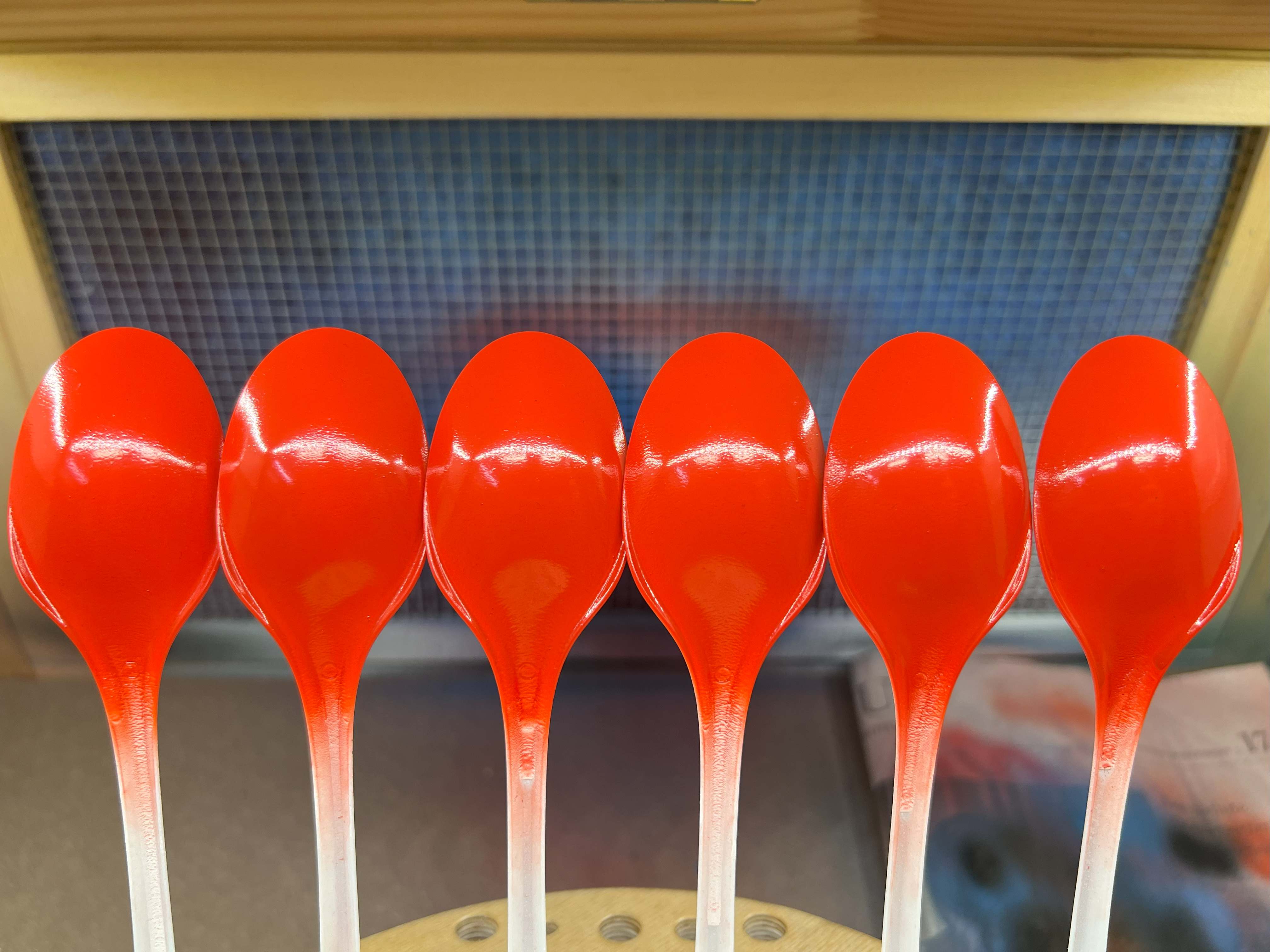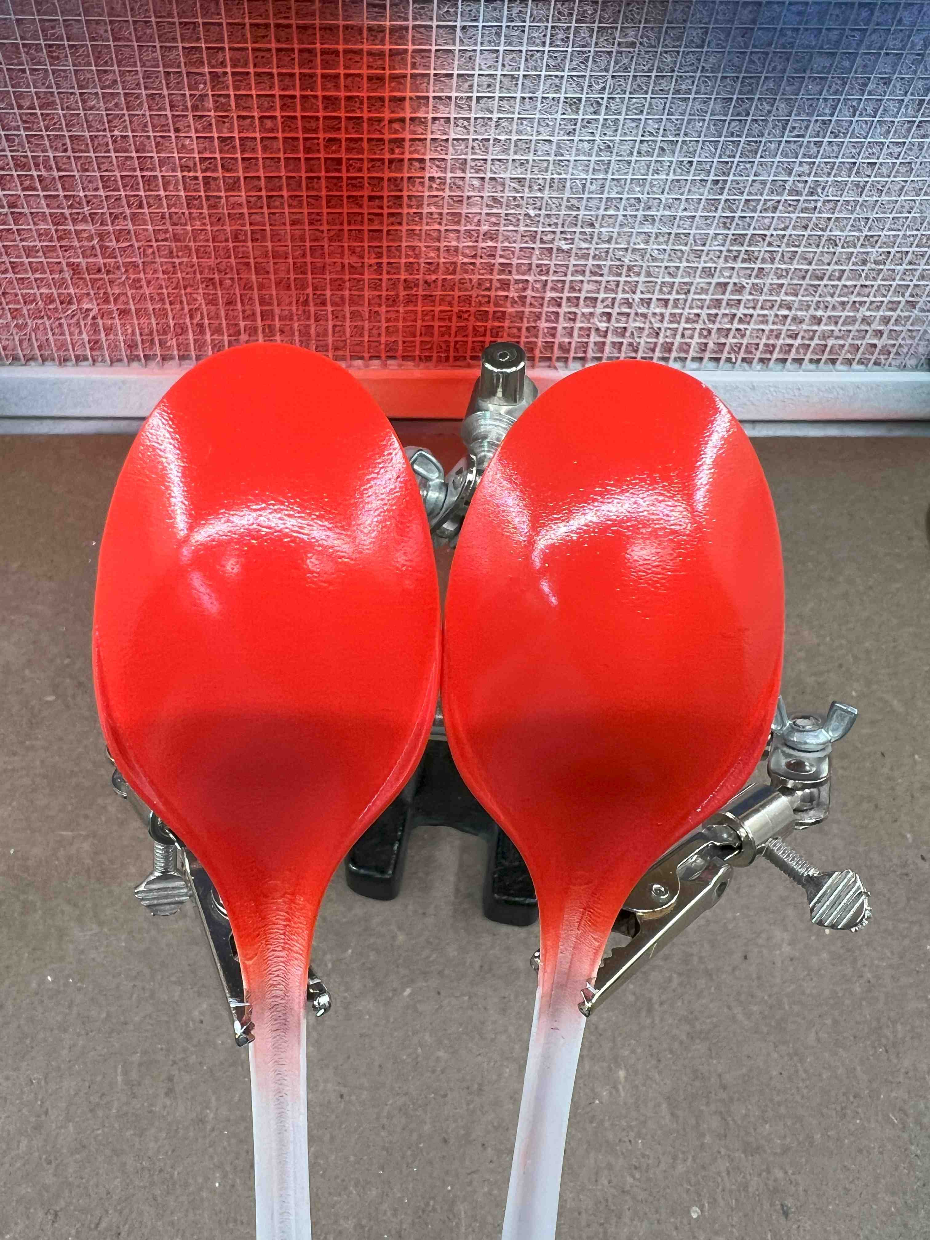 Die erste Schicht habe ich jeweils relativ grob auf getragen und bildete eine sogenannte "Klebschicht". Diese Schicht darf nicht zu deckend sein und ist ehr ein "drübernebeln" zu nennen. Dann habe ich drei weitere deckende Schichten aufgetragen, wobei ich darauf geachtet habe, dass ich jede Schicht nass in nass deckend gesprüht wurde. Zwischen den Schichten habe ich eine Trocknungsphase eingelegt bzw. ich habe den Druck um 0,2bar reduziert und mir den nächsten Löffel vorgenommen.
