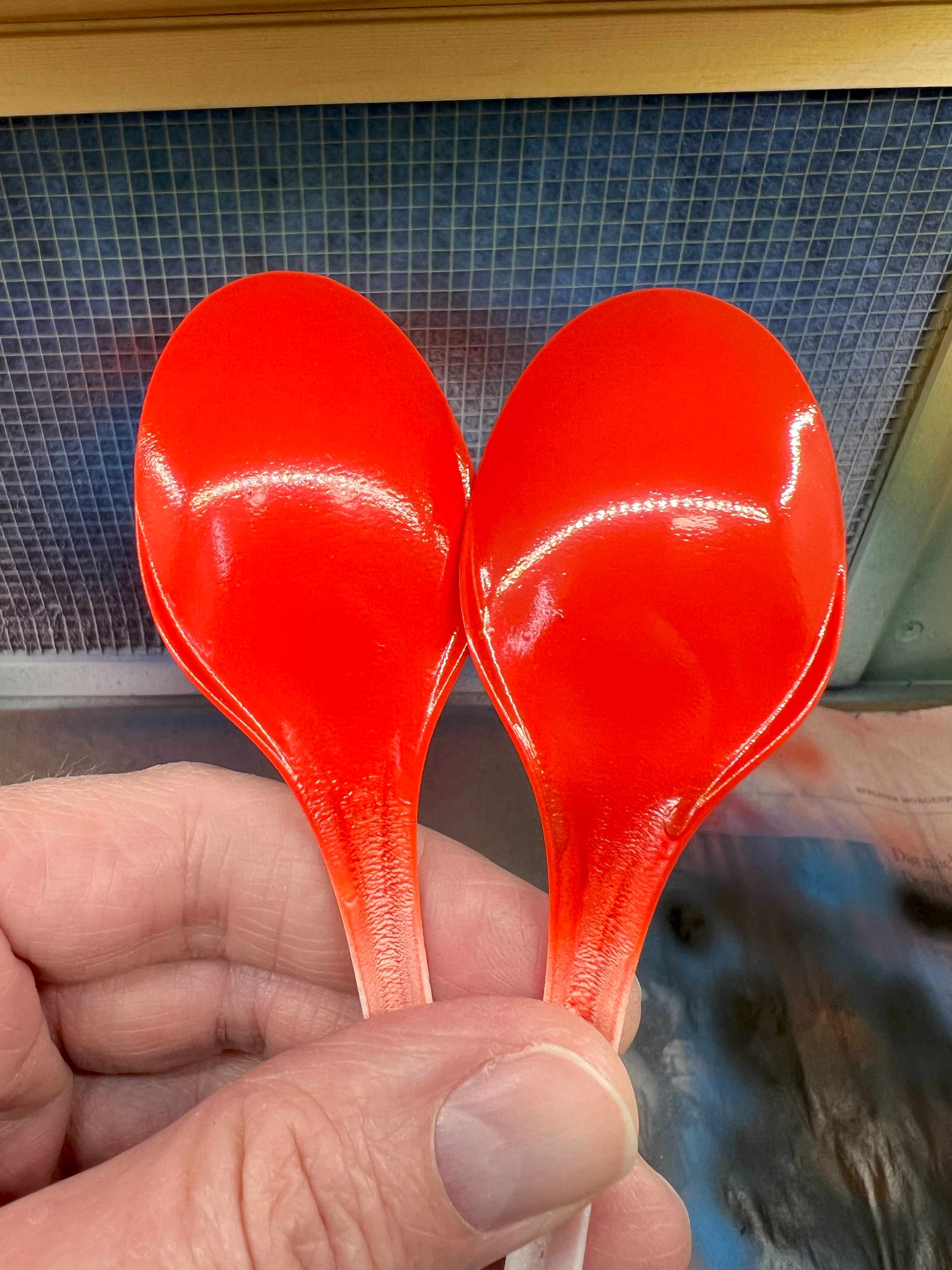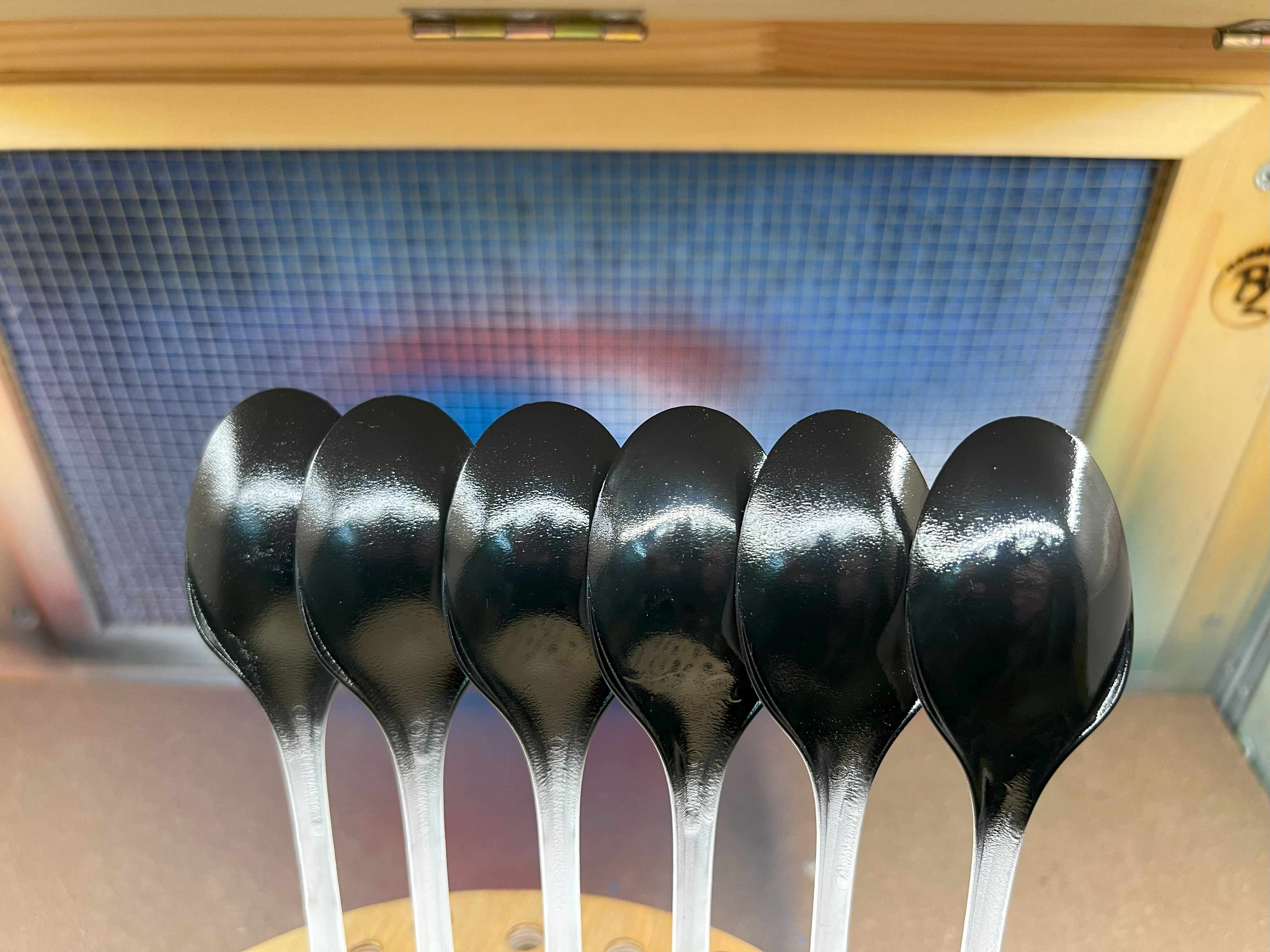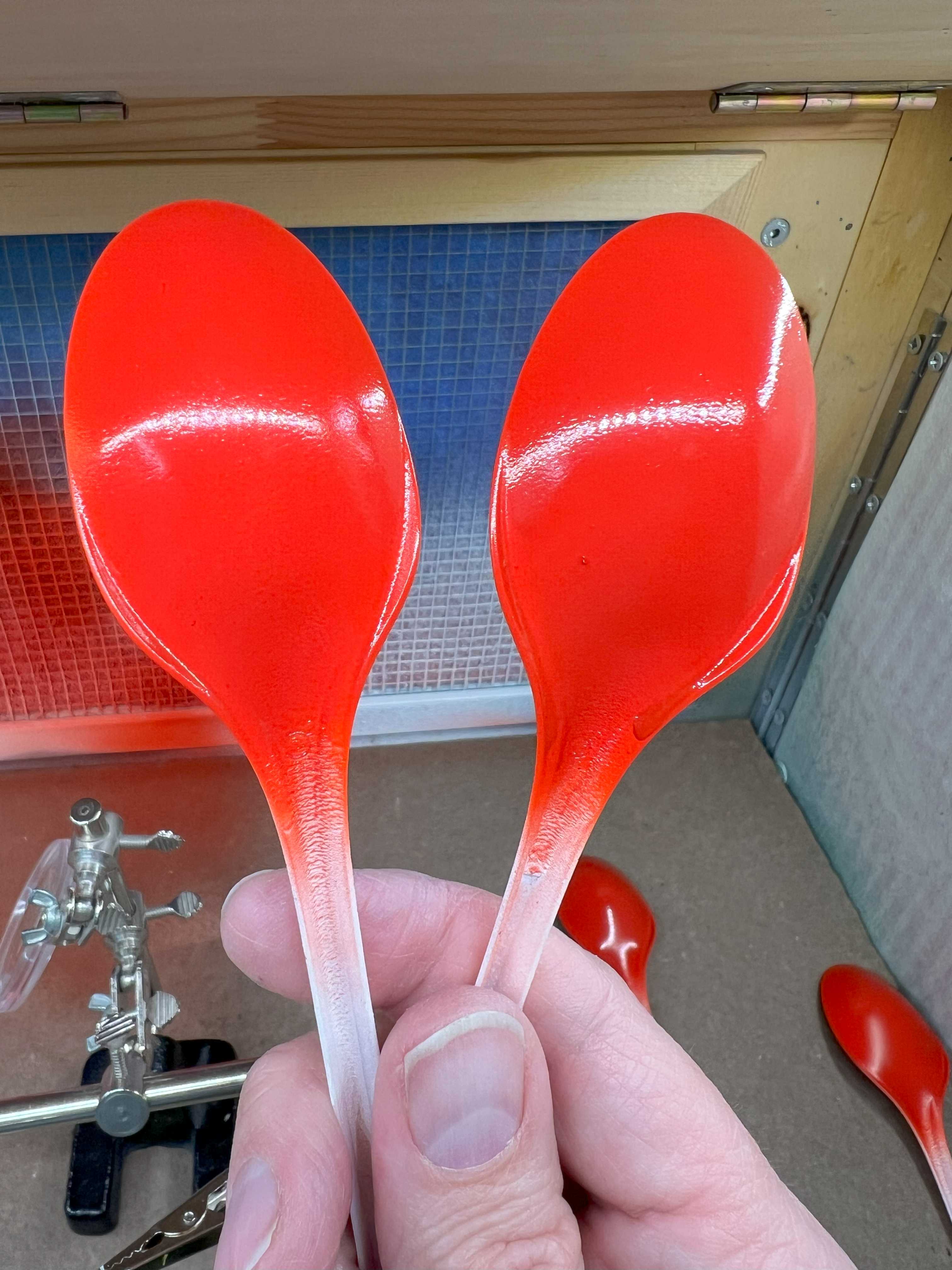 Jetzt vergleiche ich mal die beiden Löffel, die mit 0,8 und 1,0bar lackiert wurden. Man sieht hier deutlich, wie "scharf" die LED-Punkt des LED-Band reflektiert werden. Das zeugt von einem deutlich höheren Glanzgrad.