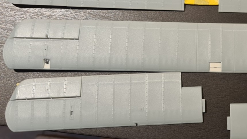 Das Spannende an den Tragflächen ist, dass diese innen Seilzüge enthalten, die man später durch Klarsichtteile sehen kann. Das macht es in der Aufarbeitung nicht gerade einfacher. Von solchen Aussparungen in den Flügeln spreche ich: