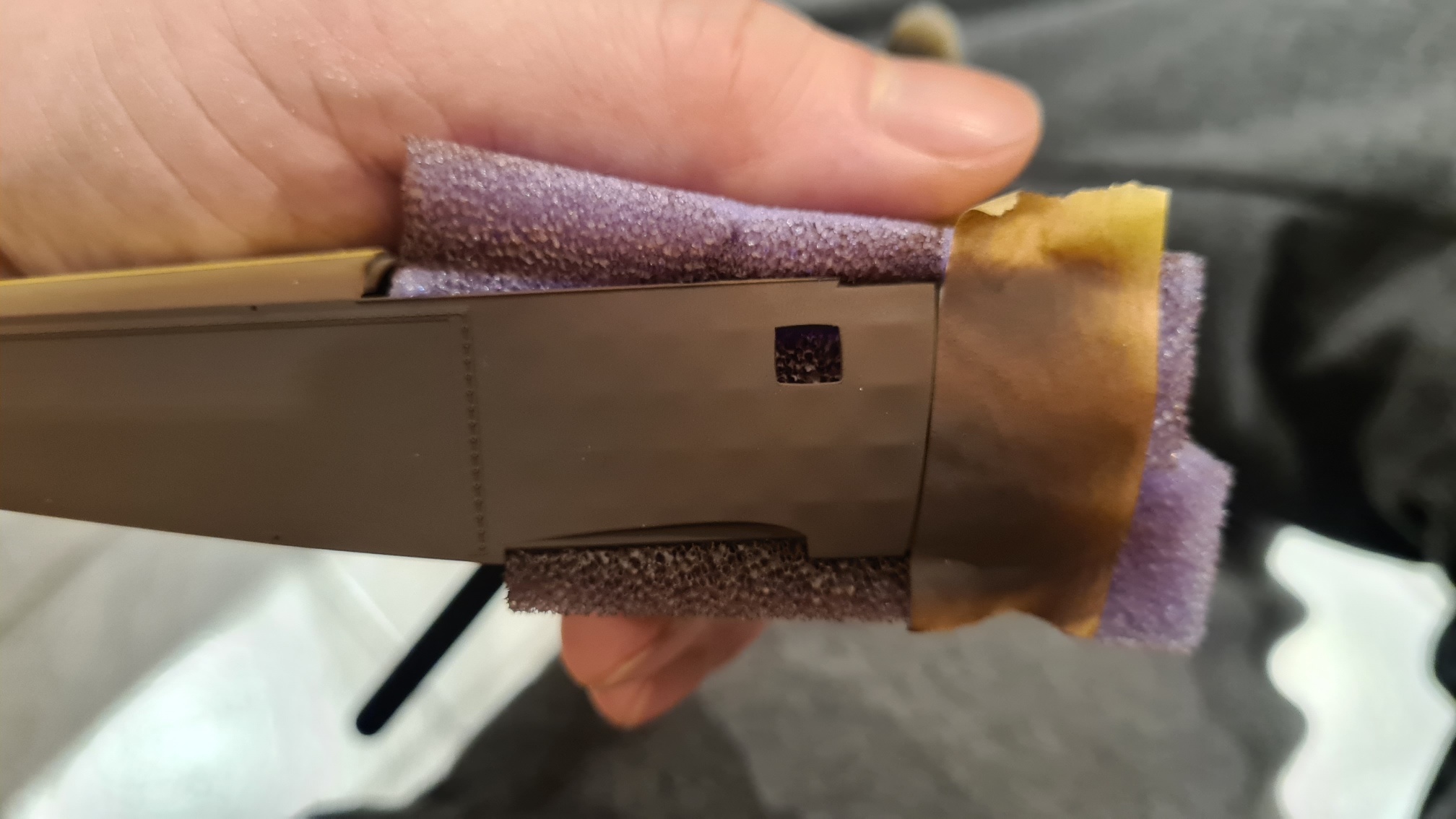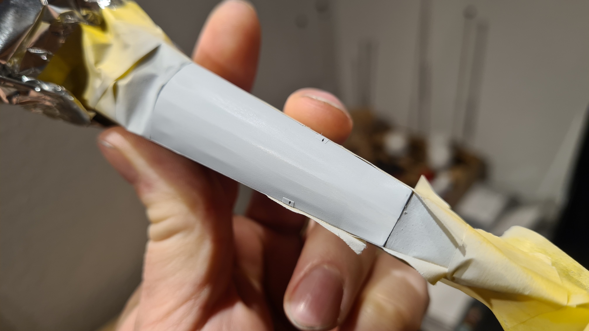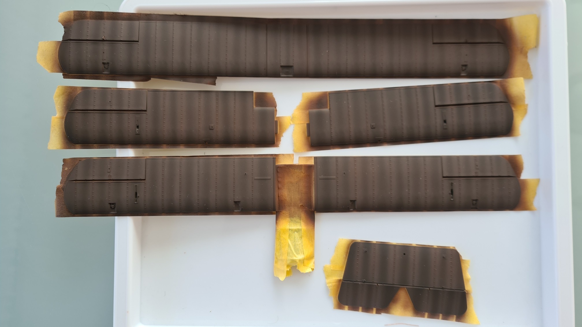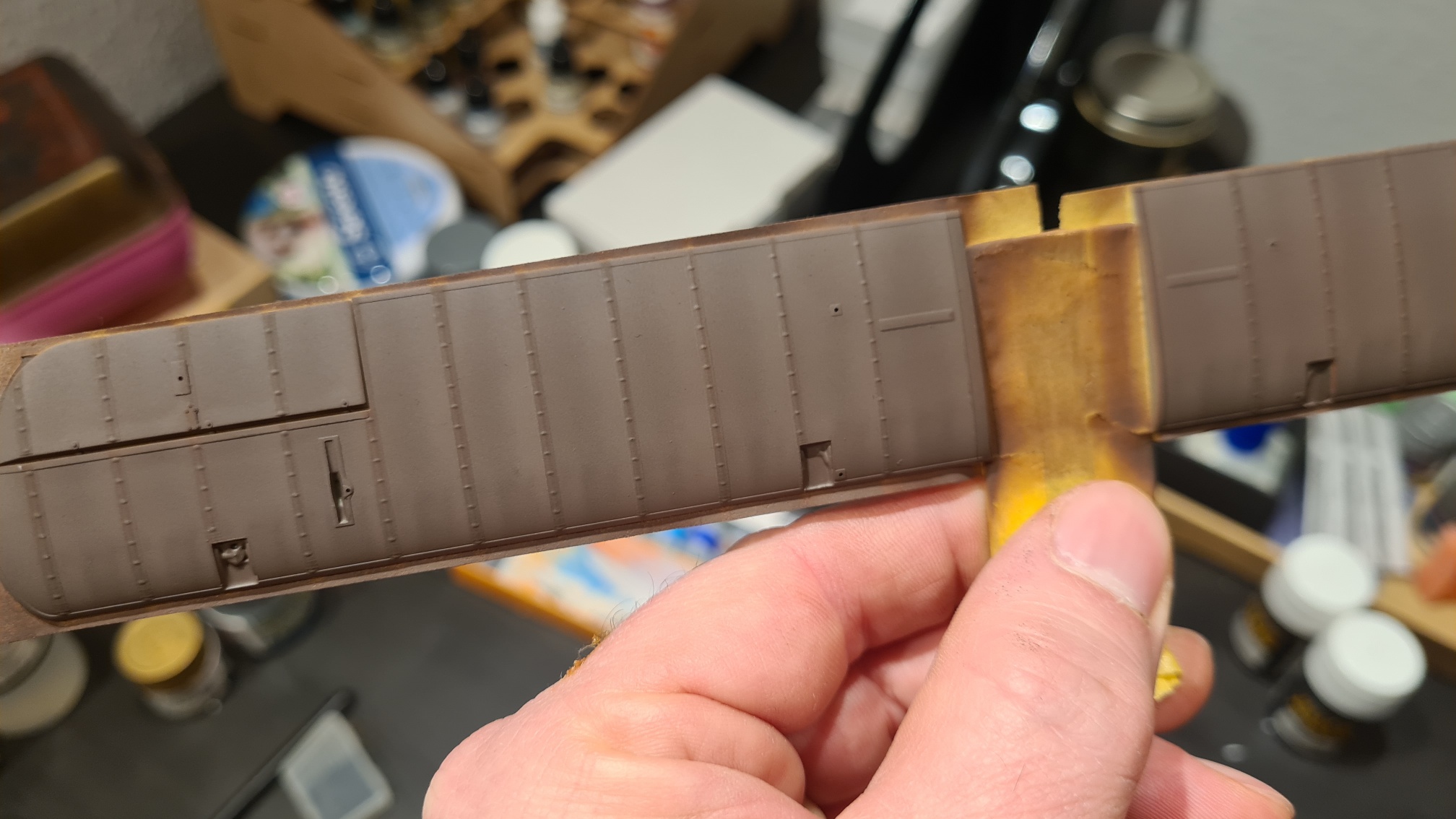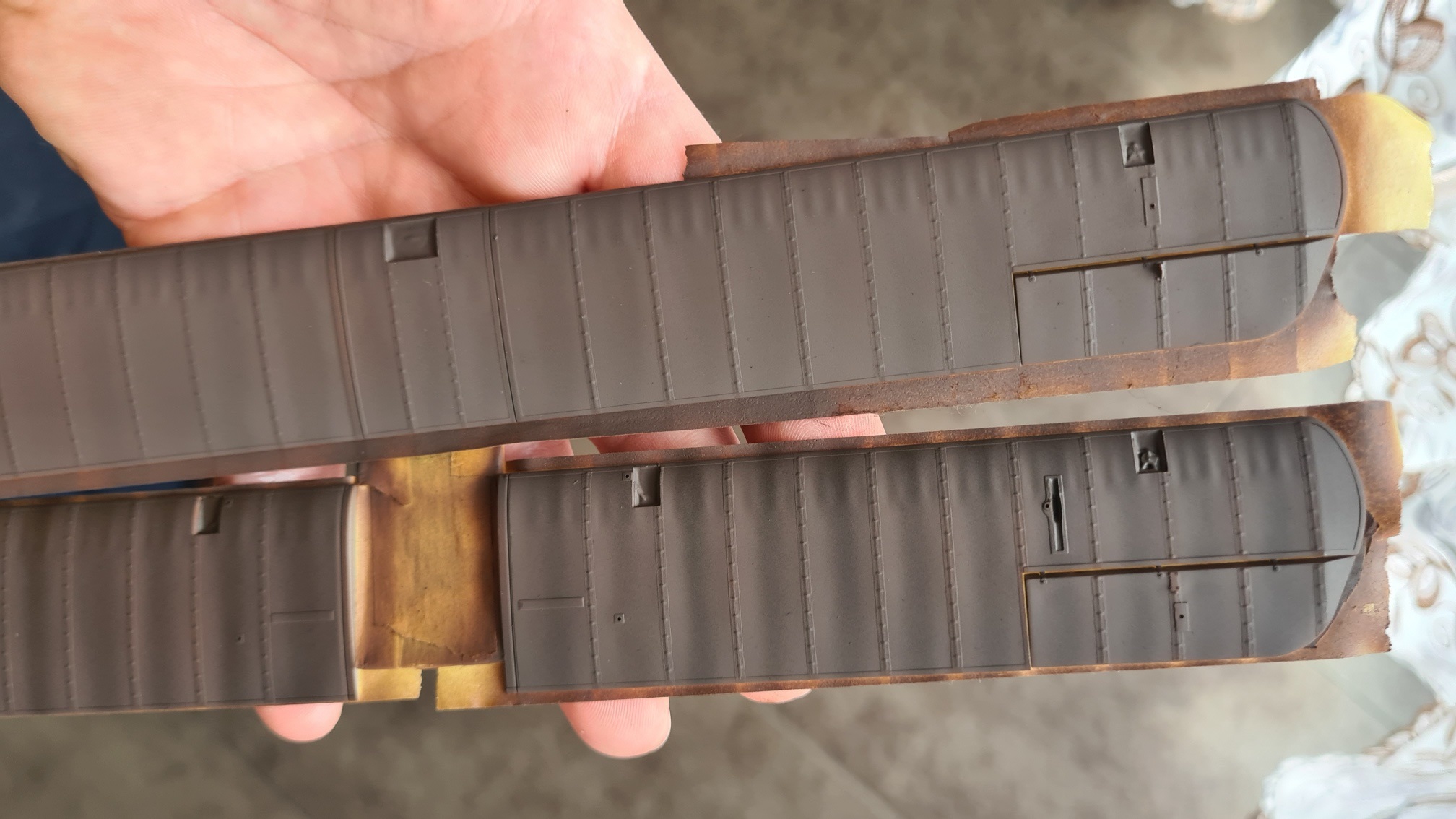 Die Oberseite ist heikel, weil sich auch hier die Holzkonstruktion durchdrückt und das keinesfalls weggeschliffen werden darf. In beiden Fällen war es sehr hilfreich, die Naht mit Maskierband abzukleben und nur einen Spalt von vielleicht einem halben mm zu lassen. Dieser wurde mit Mr Surfacer 1200 gefüllt.