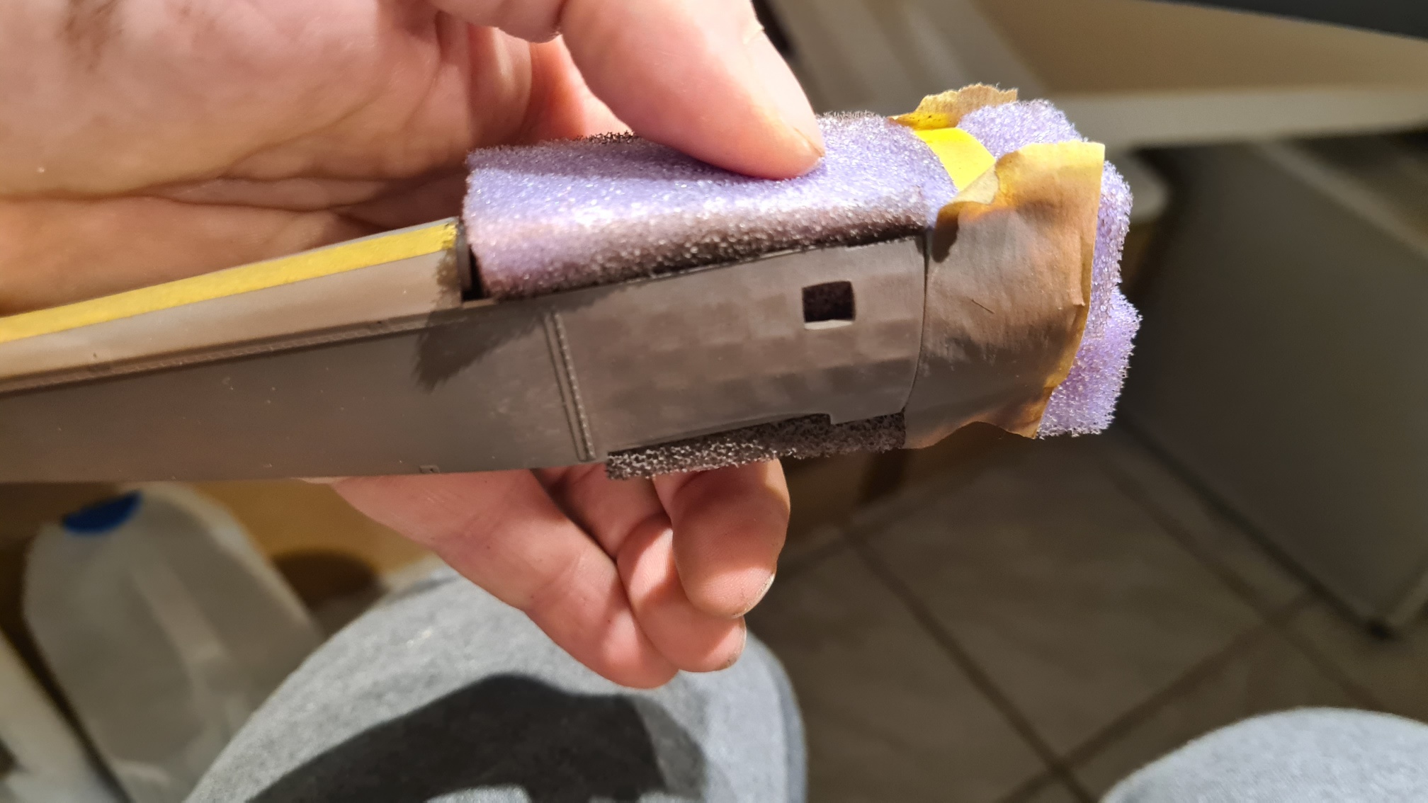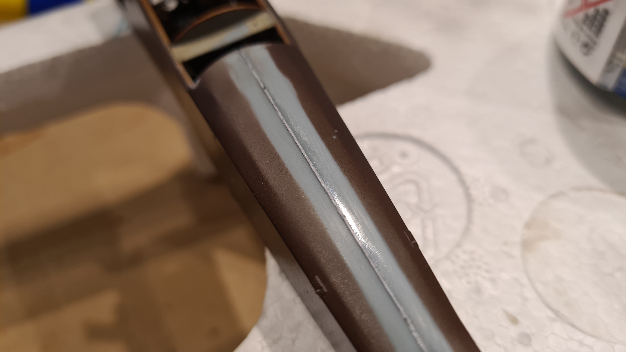 Nochmal eine ganz deutliche Empfehlung für das Zeug von Mr Surfacer. Mit dem 1200 hab ich die Nähte aufgefüllt. Mit etwas Maskierband an den Seiten wurde ein kleiner Berg aufgetragen, der dann mit der Zeit etwas einsinkt. Maskierband recht schnell (innerhalb von Minuten) entfernen, damit es beim Abziehen keine Schäden in der Naht hinterlässt. Abschleifen. Dann MrSurfacer 1500 1:1 mit dem zugehörigen Verdünner aufgesprüht. Leichte Imperfektionen können dann direkt weggeschliffen werden. Und das Zeug lässt sich z.B. mit eine Poliernagelfeile beinahe spiegelnd glatt bekommen. Ich nehme glaub ich nichts anderes mehr für solche Arbeiten. Aber Achtung, das ist bestimmt noch ungesünder als es stinkt. Ohne Schutz hab ich sofort Kopfschmerzen.
