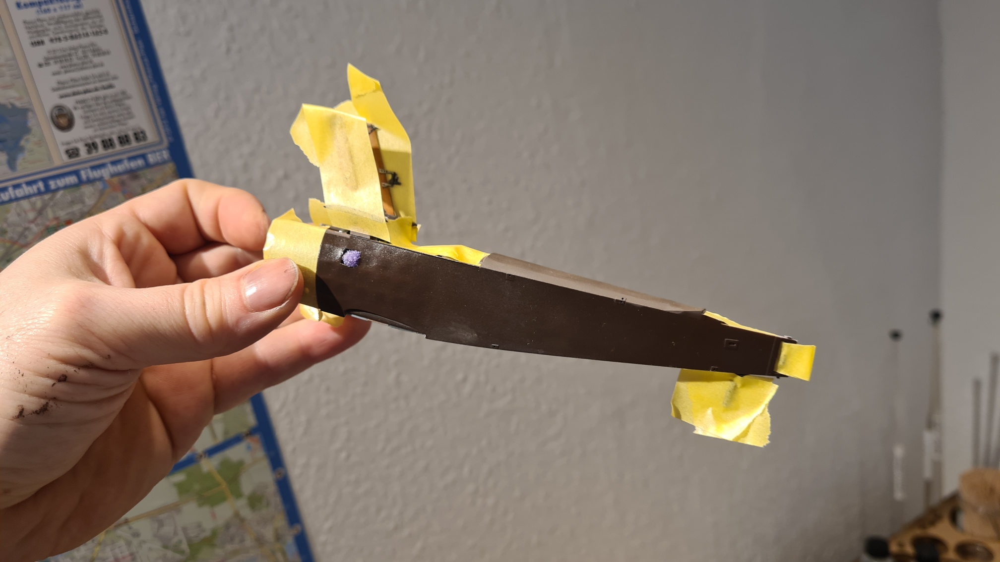 Und hier nochmal ein Bild mit aufgelegtem Höhenruder. Da hab ich schon mit der Alterung mit Ölfarbe gespielt (und vergessen, die Fussel wegzupusten).