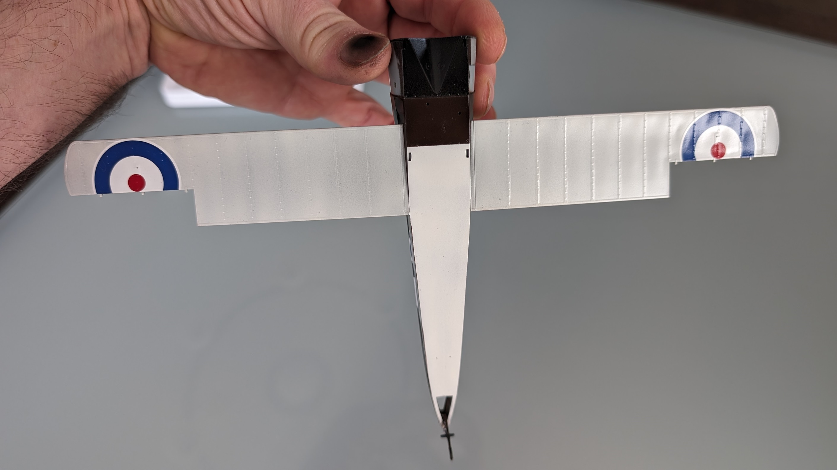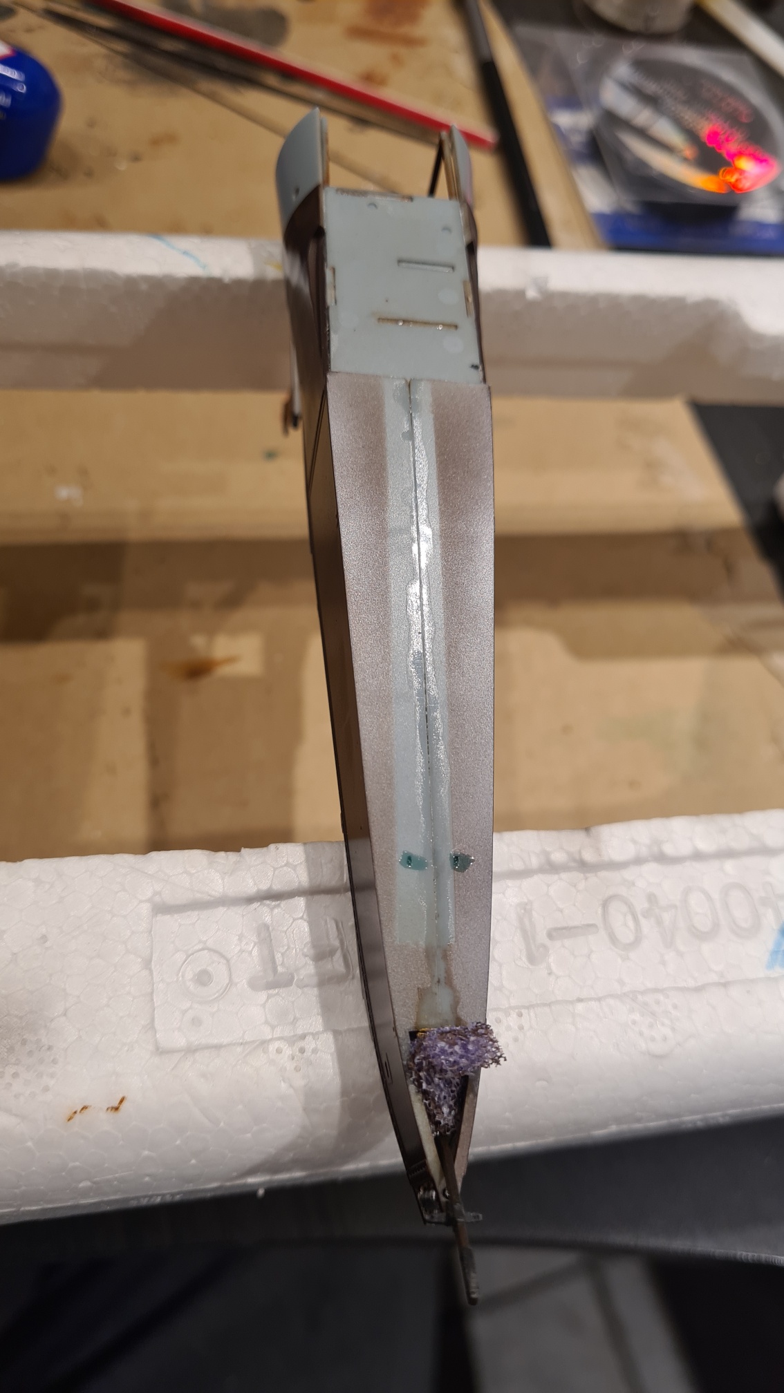 Die untere Tragfläche wurde angeklebt, Spalte entsprechend verspachtelt.