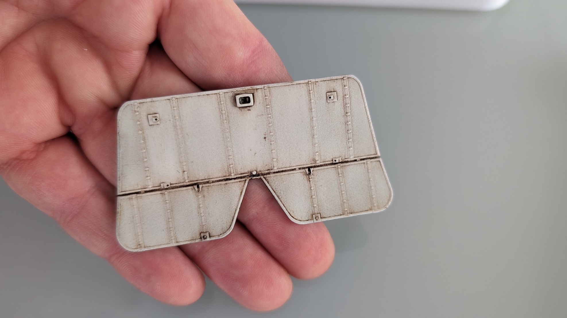 Hinterher wurde mit der Grundfarbe (sehr stark verdünt) und der Airbrush nachgearbeitet. Immer schön mittig rein in die Rechtecke, aber vorsichtig, nur ganz fein, sonst entstehen runde Farbansammlungen, die verlaufen.