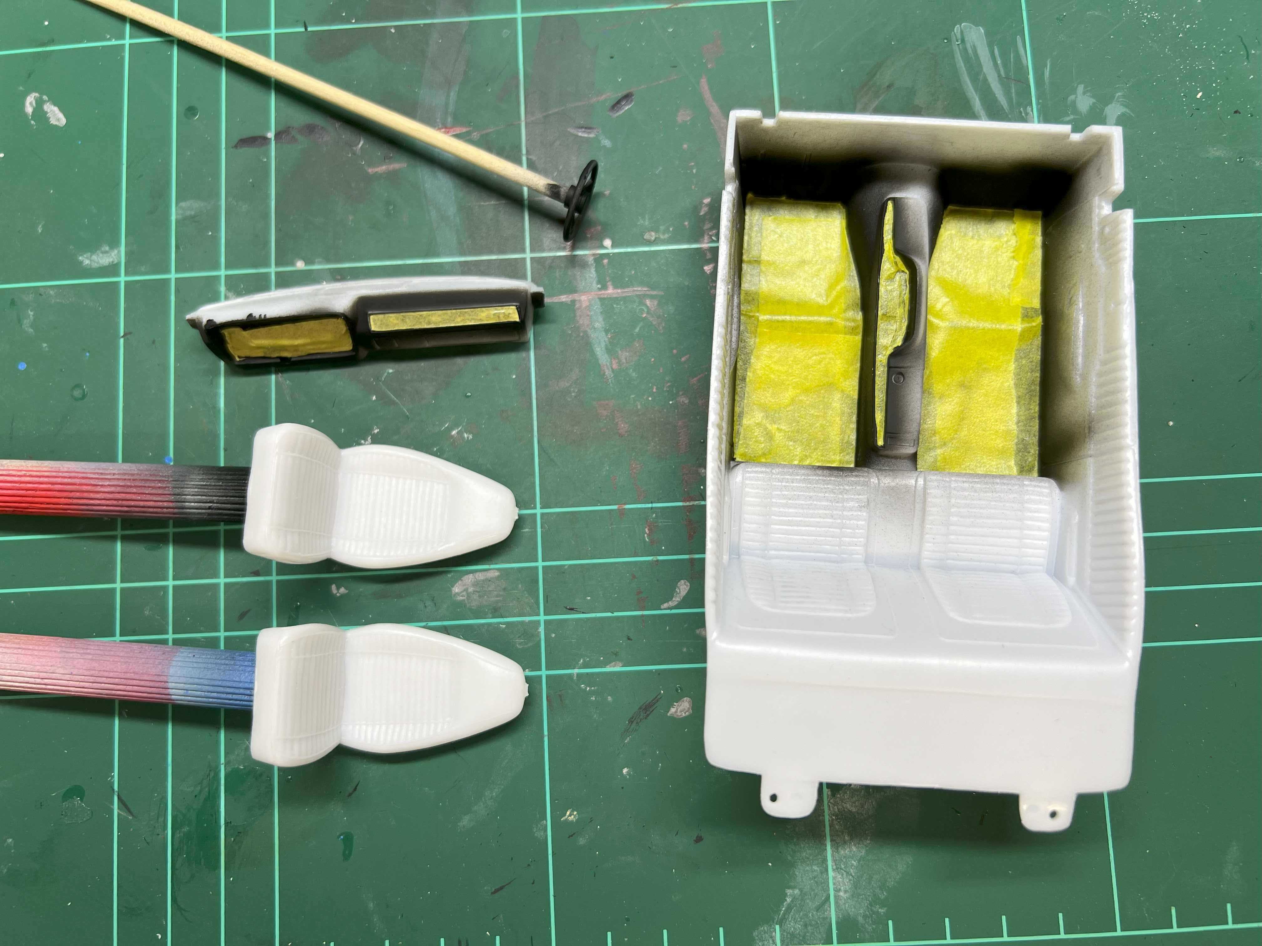 Der Boden und ein paar Elemente am Armaturenbrett wurden in matten Schwarz vorbereitet und anschließend abgeklebt.