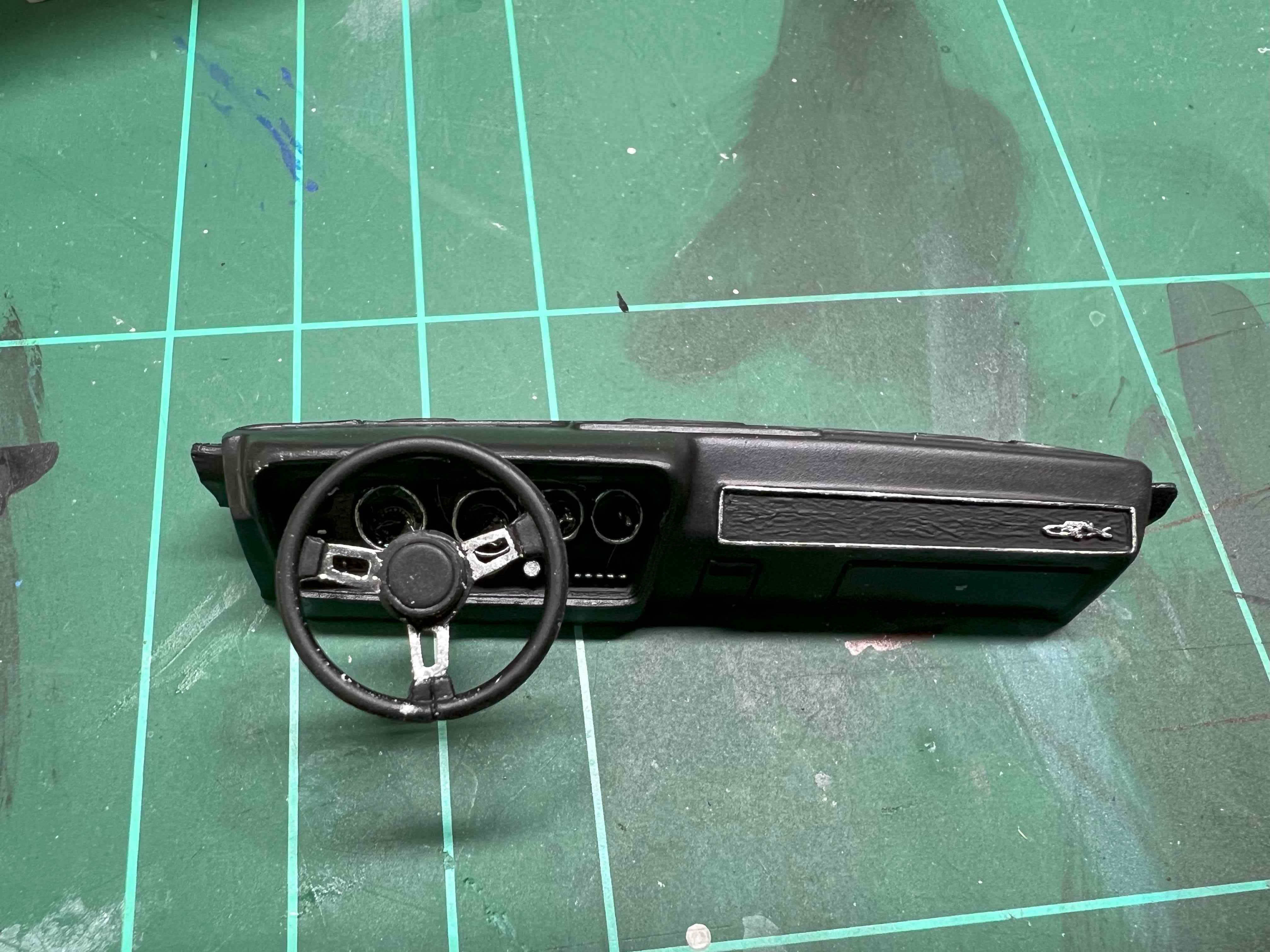 Dem Armaturenbrett habe ich noch ein paar Akzente gegönnt. Da mir aus dem Film kein Bild zur Verfügung steht, habe ich das etwas "Frei-Schnauze" gemacht.