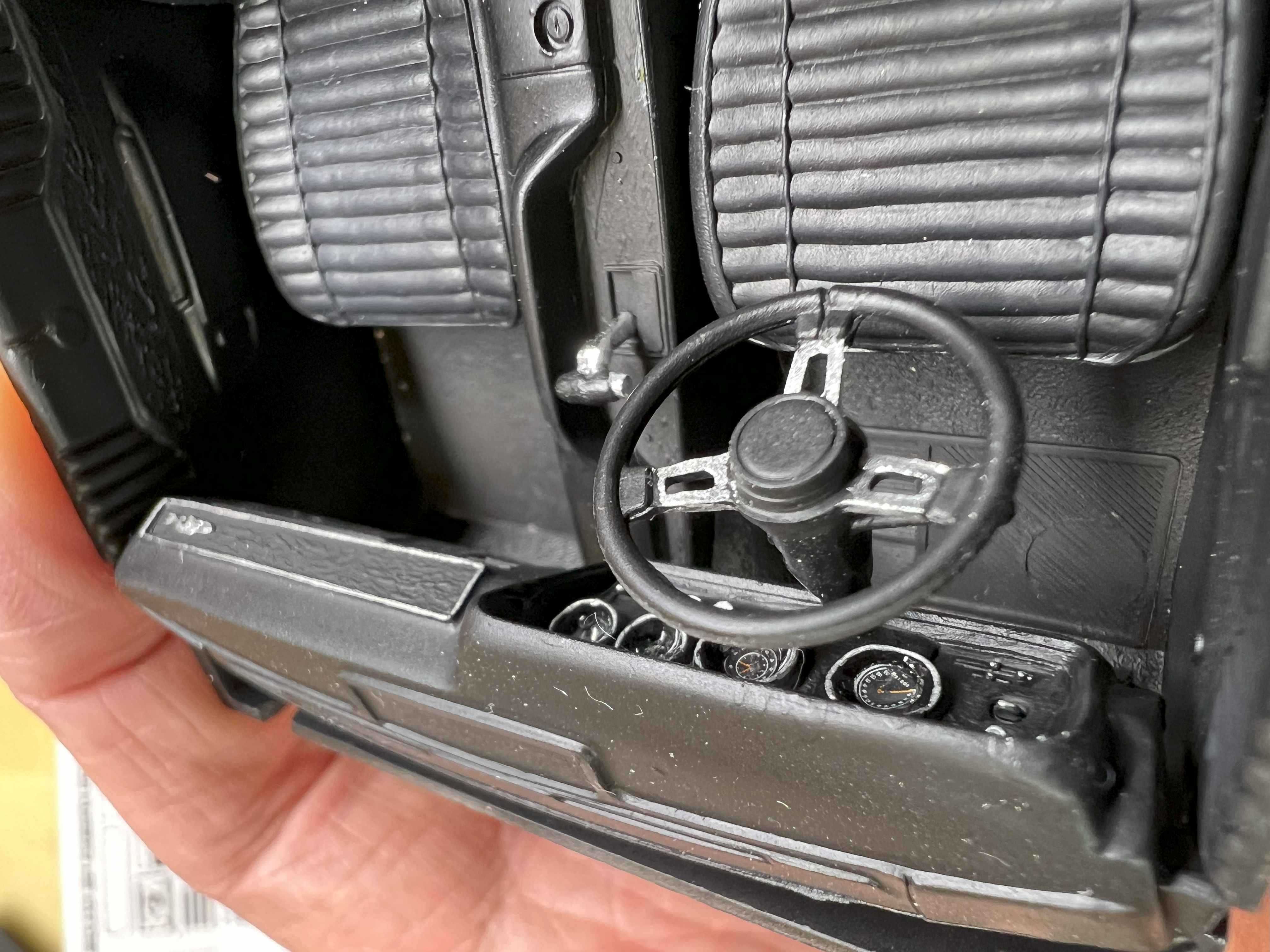 Die hellen Flecken auf dem Lenkrad habe ich erst auf dem Foto bemerkt. Das müssen Fussel oder Reflexionen sein, da auf dem Lenkrad am Modell nichts zu sehen ist.