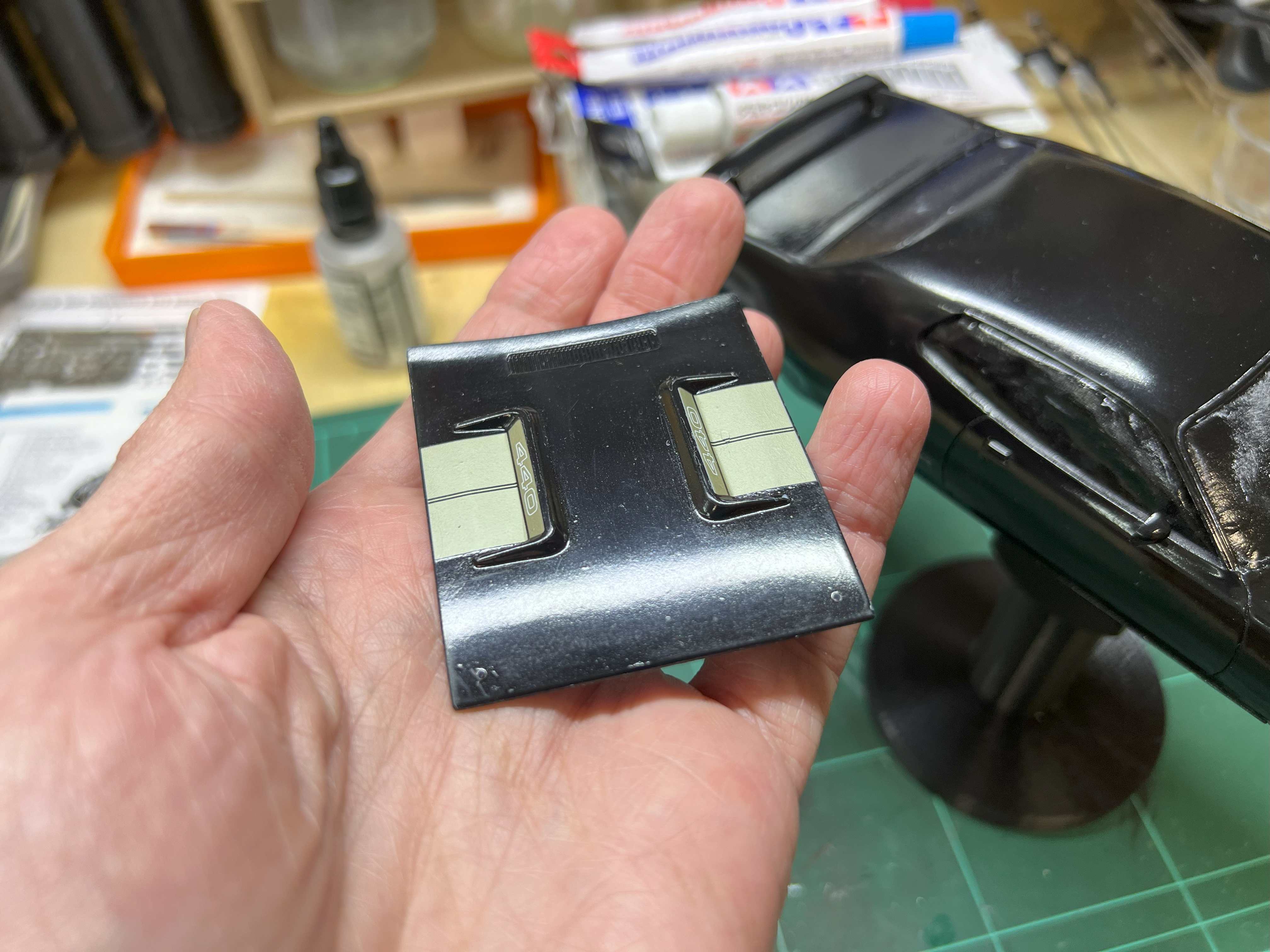 Im Frontkühlergrill ist auch ein "GTX" Schriftzug integriert. Den habe ich mit einem Ätzteil hervorgehoben. Laut Anleitung sollte dieser auch schwarz sein, aber das sieht an dem Auto im Film anders aus.