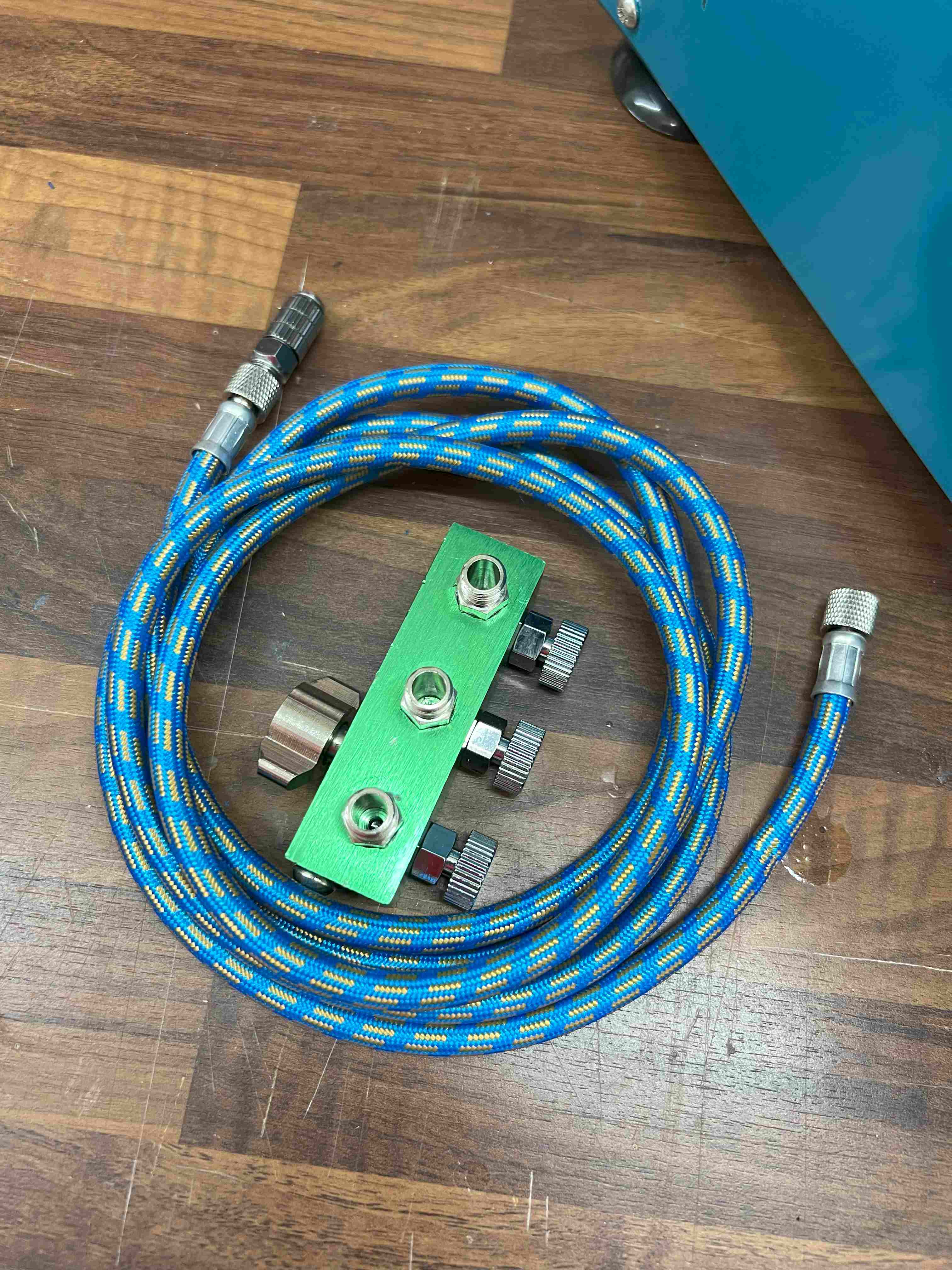 Dazu habe ich mir noch etwas Zubehör gegönnt, wie einen neuen Schlauch und eine 3-fach Verteilung, so dass ich meine beiden Gun's und meine Ausblasdüse parallel anschließen kann.