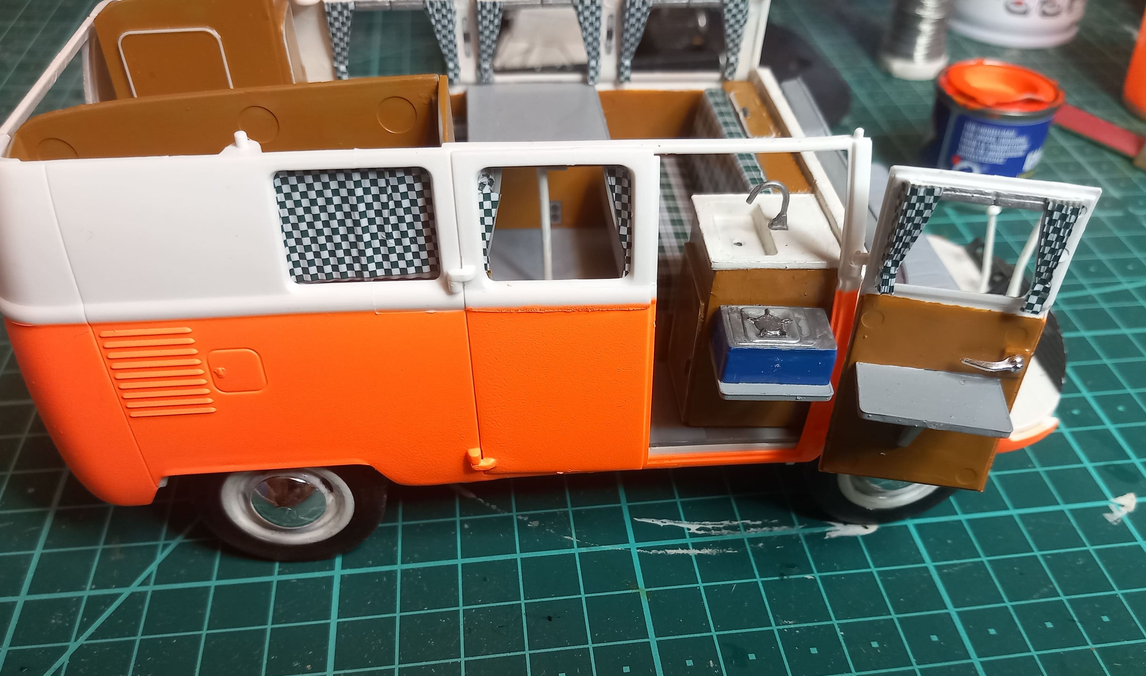 Auch die rechte Seite vom Camper ist vorbereitet. Das Aufsetzen der beiden Seiten auf das Chassis ist alles andere als einfach weil gleichzeitig die Heckklappe und die Motorklappe eingesetzt werden sollen. Beim ersten Versuch knickte ein Pin an der Motorklappe ab. Mühselig mit doppelter Lupenbrille und Spezialkleber repariert und dann 4-5 Versuche, tiefem Durchatmen und einer Menge Glück, ehe die Pins der Klappen in die dafür vorgesehenen Öffnungen eingeführt waren. Alles kurz davor daß da noch mehr abbricht. Gut, es hat geklappt, aber eine dritte Hand (zusätzliche Person) die die Klappen dahin führt, wo sie hinsollen, wäre absolut von Vorteil.Die beiden Seitenteile vom Bulli passen aber astrein auf das Unterteil.