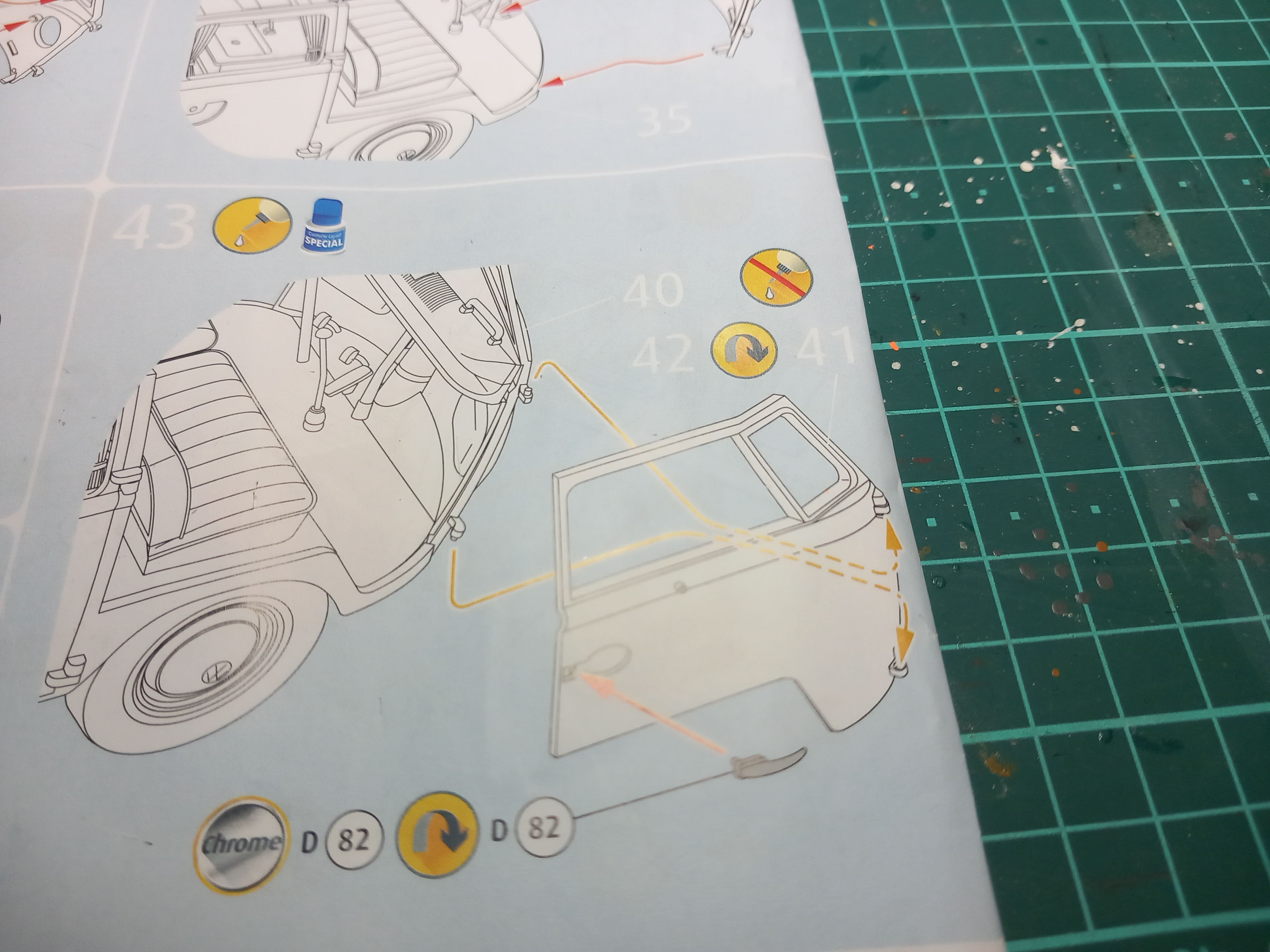 Die Vordertüren....Da sind die Probleme :thumbdown: Trotz Lupenbrille und Pinzette sind mir bei beiden Türen die Pins abgebrochen, die in die Aussparung der Türen greifen sollen. (Vielleicht bin ich zu ungeschickt dazu). Jedenfalls habe ich beide Türen fest eingeklebt. Die Beifahrertür kann ich eeh nicht offen darstellen und bei der Fahrertür ist es auch nicht sooo schlimm.