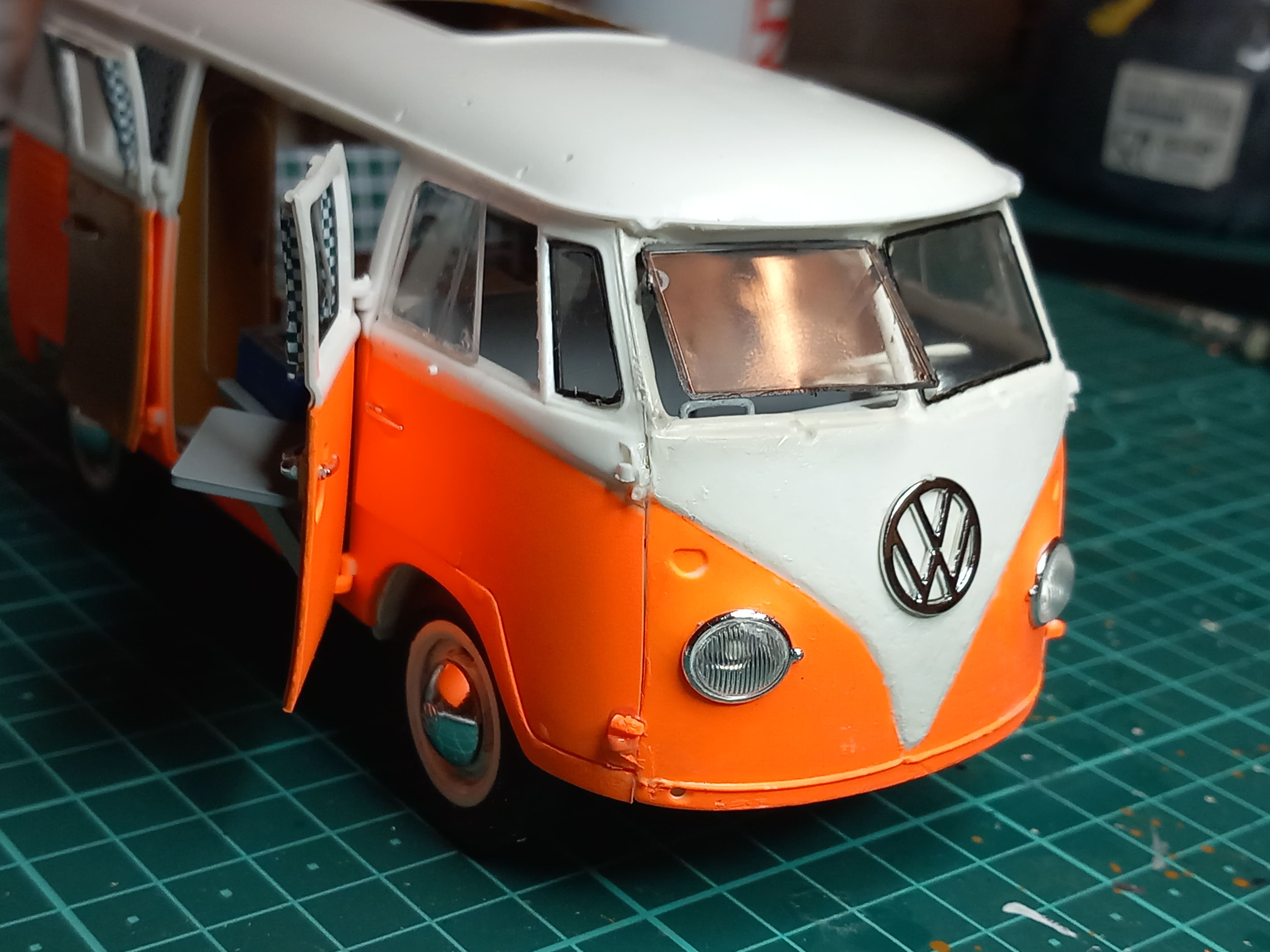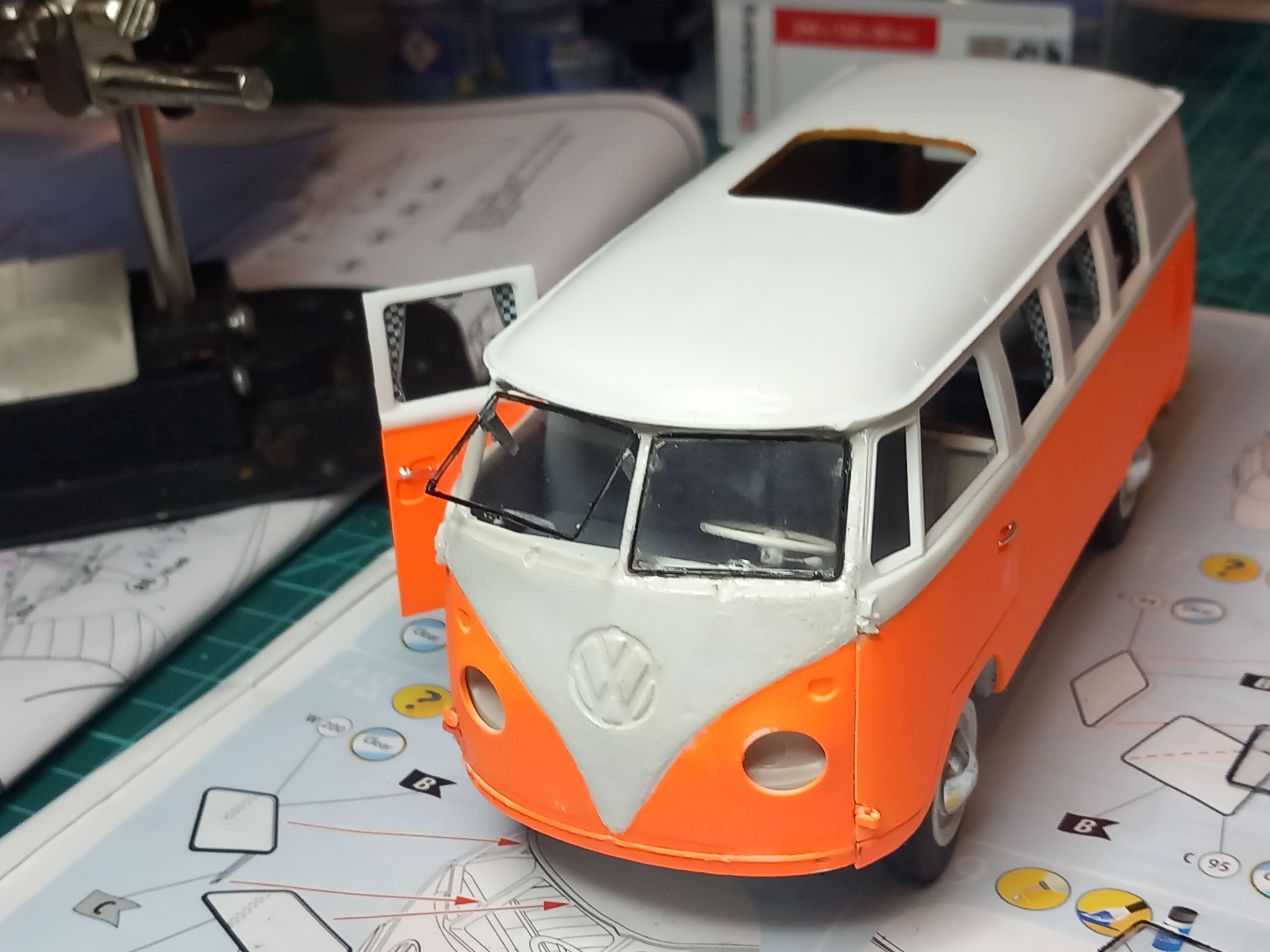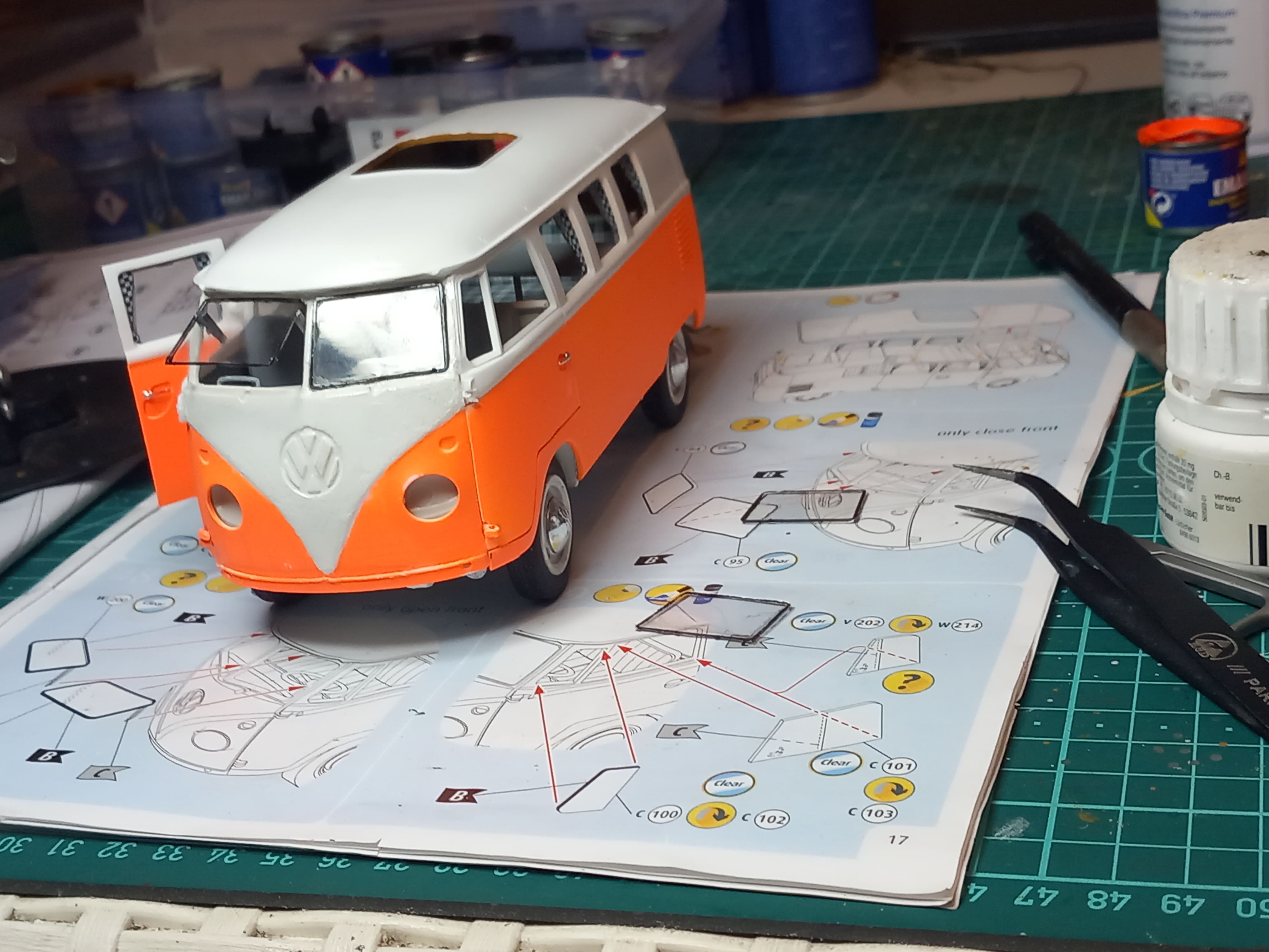 Die Scheinwerfer sind eingebaut. Ebenso das VW Emblem und die vorderen Seitenfenster. Gruß Ingo