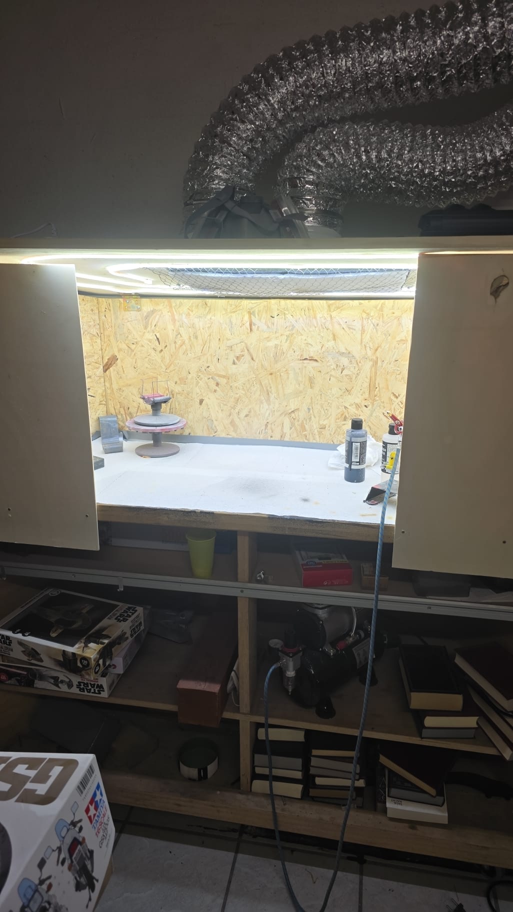 In meiner "Zweitwerft" habe ich eine kleine (fertig gekaufte) Abzugskabine. Da ich nicht nach aussen entlüften kann
