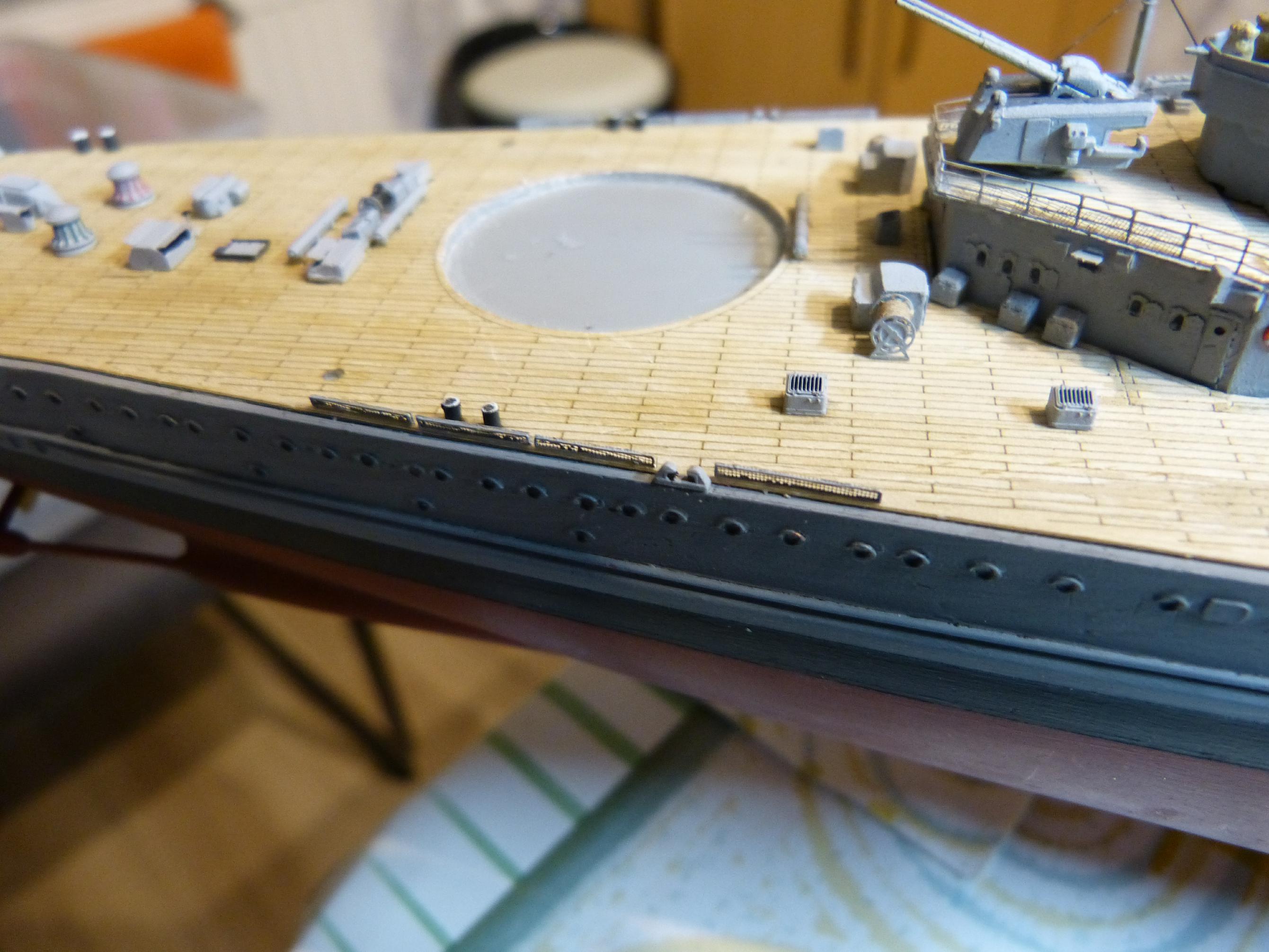 Wenn die schwere und mittlere Artillerie geschossen hat, wurden die leeren Kartuschen aus dem jeweiligen Turm entfernt, und zwar auf das Hauptdeck. Dort konnten sie leicht in die See rollen, zumal meist die Reling in dem Bereich umgelegt wurde. Die Kartuschen waren aber relativ wertvoll und konnten höchstwahrscheinlich später wiederverwendet werden. Daher musste der Verlust an die See verhindert werden. Zu diesem Zweck gab es spezielle Abweiser oder Fänger die im Bereich der Geschütztürme installiert waren. Wo diese genau platziert waren, ist auf den Originalplänen ersichtlich. Ich habe sie auch auf allen meinen Schlachtschiffen mit dargestellt. Bei TP waren sie mit in den Ätzteilen der Reling integriert, was eigentlich nicht korrekt ist, denn sie hatten einen gewissen Abstand zu dieser. Für die GU entstanden die Abweiser hier aus Reling-Ätzteilen und feinster Gaze (Teebeutel), anschließend in RAL7001 bemalt.