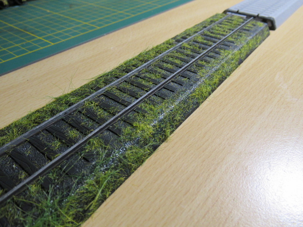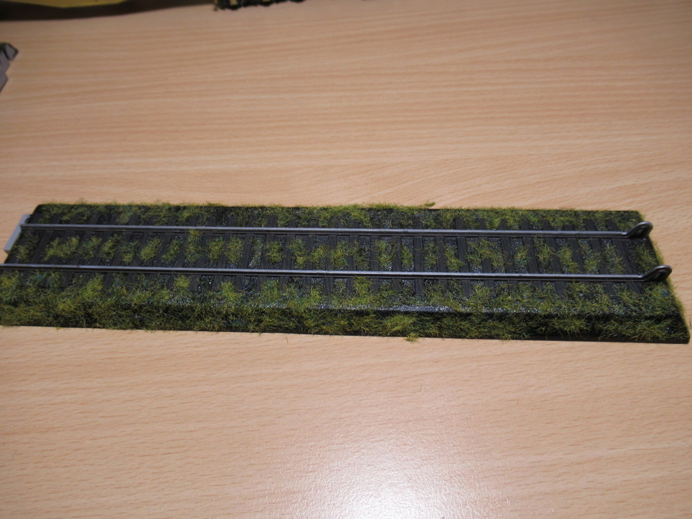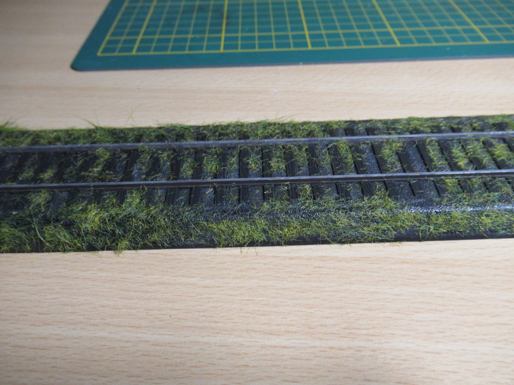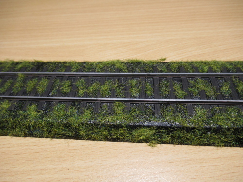 Habe dann aus dem Modelleisenbahnbau von NOCH Streuwiese drüber gestreut . Etwas warten und dann das Gleisbett umdrehen und leicht anklopfen sodas überschüssiges herunter fällt . Fertig