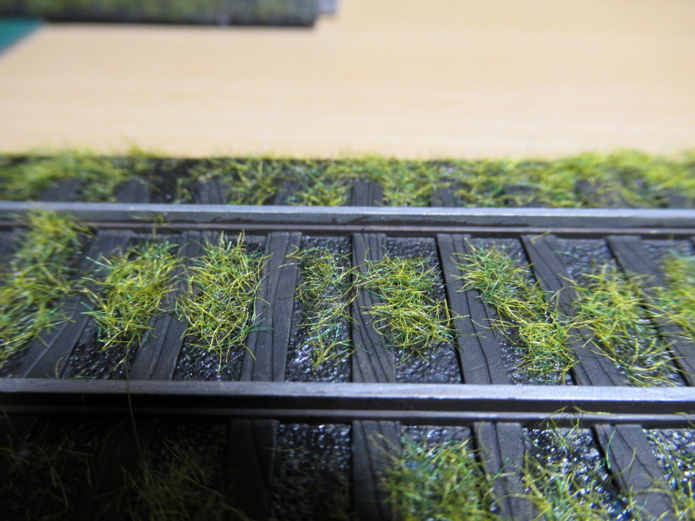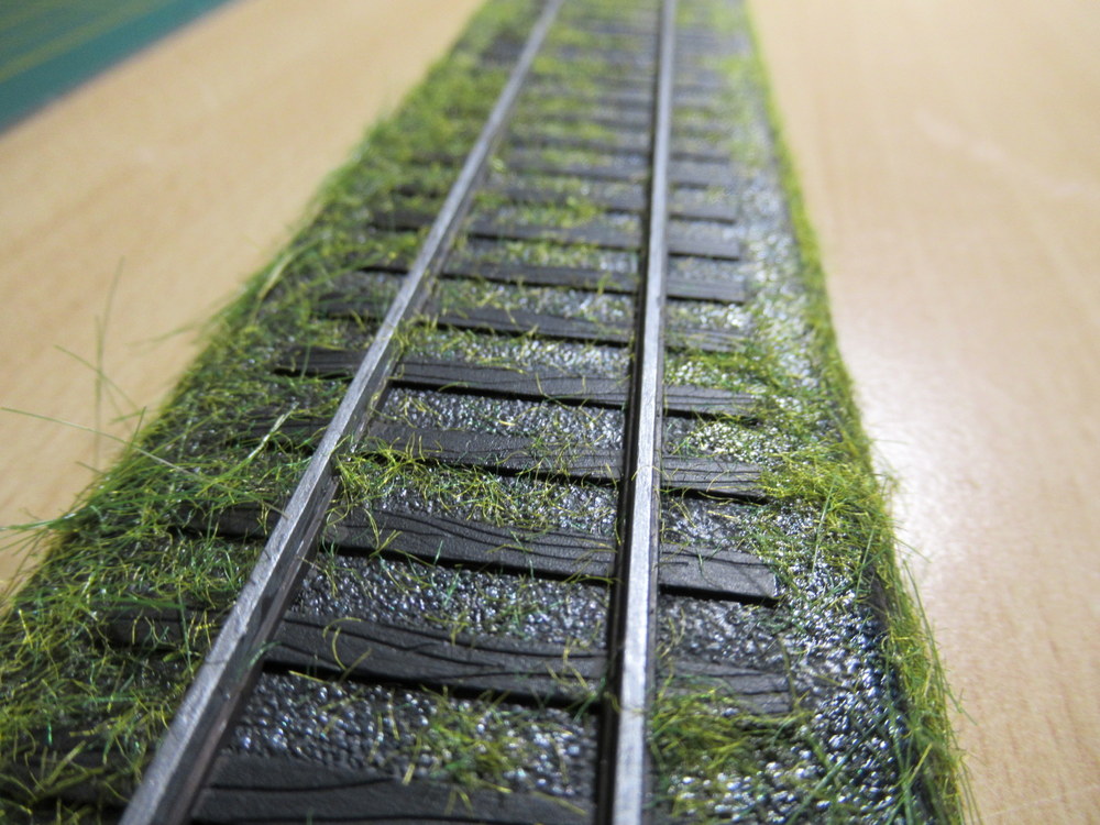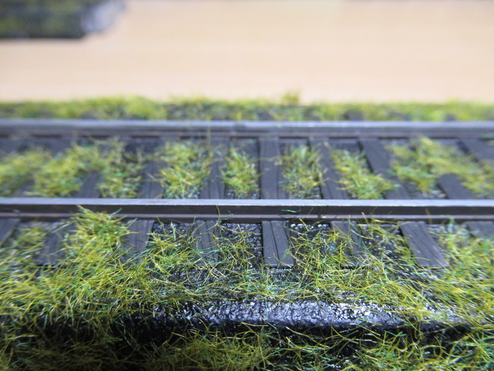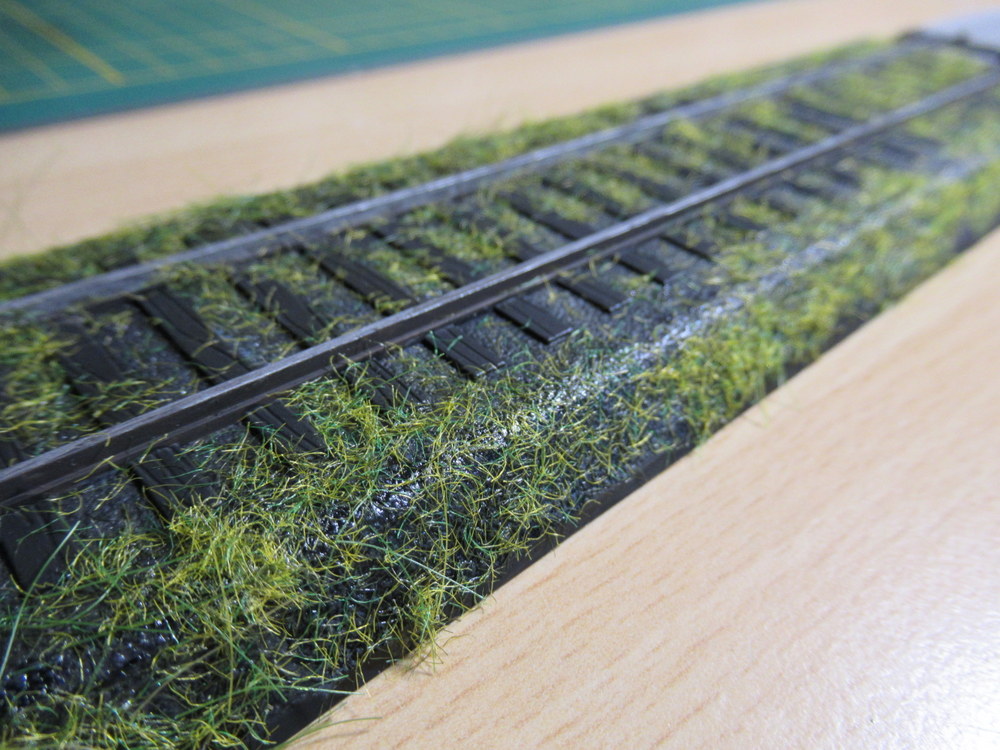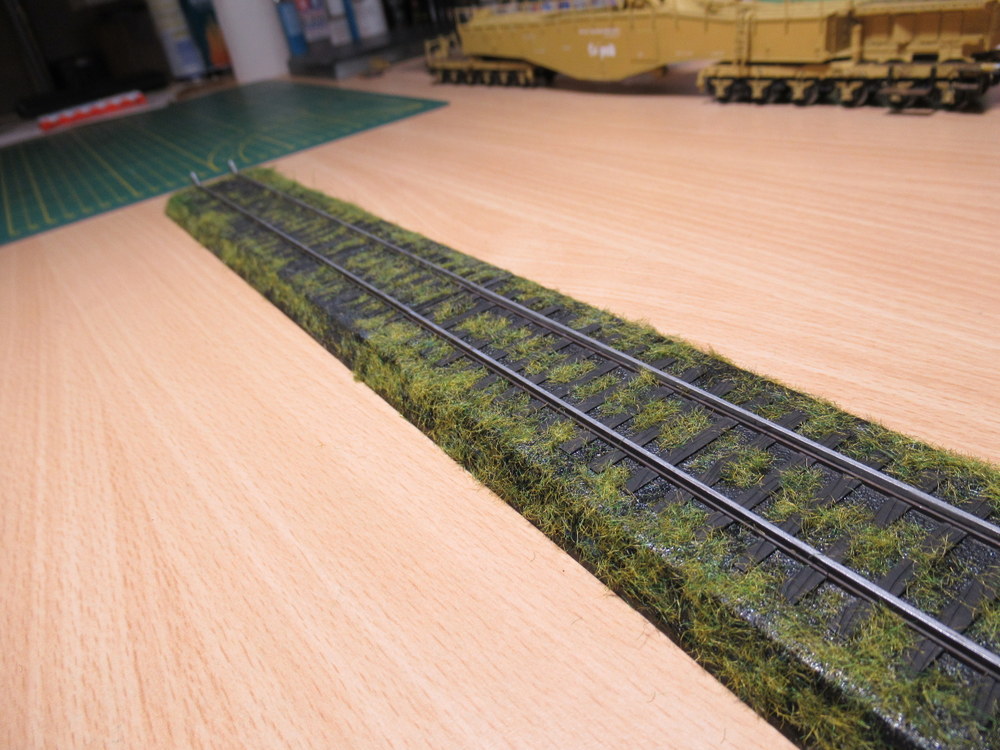 Habe dann aus dem Modelleisenbahnbau von NOCH Streuwiese drüber gestreut . Etwas warten und dann das Gleisbett umdrehen und leicht anklopfen sodas überschüssiges herunter fällt . Fertig