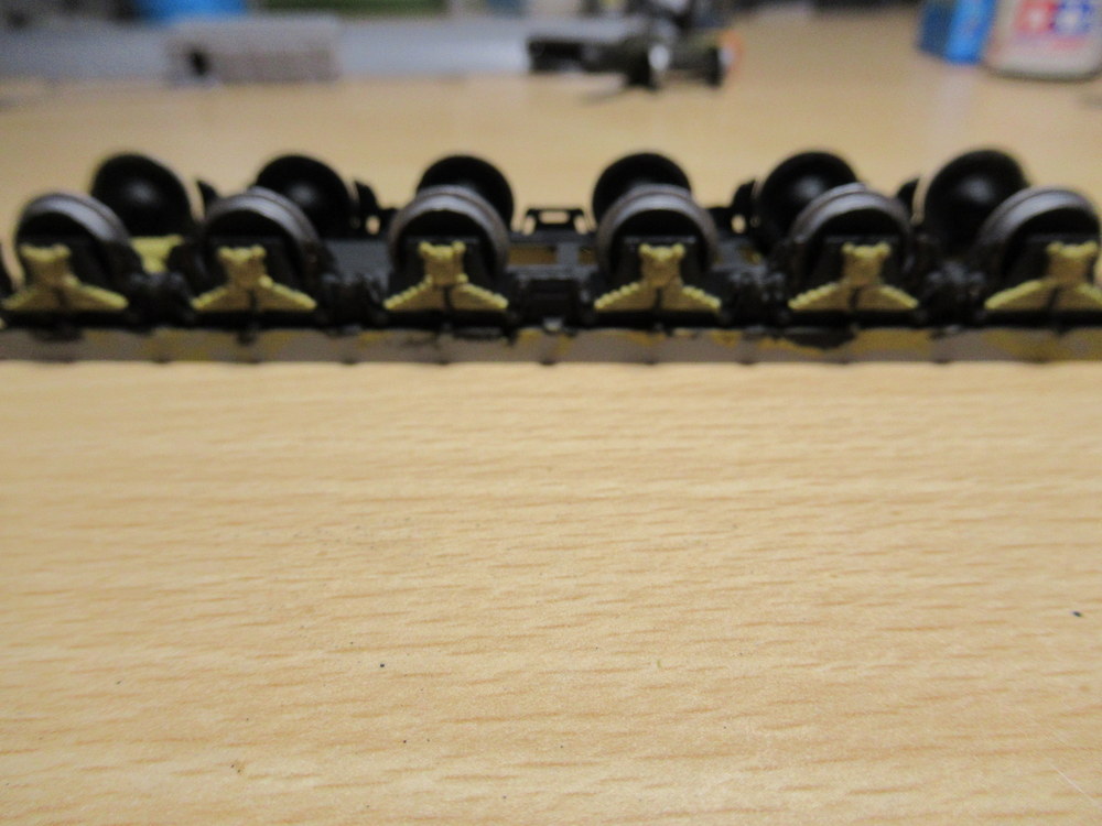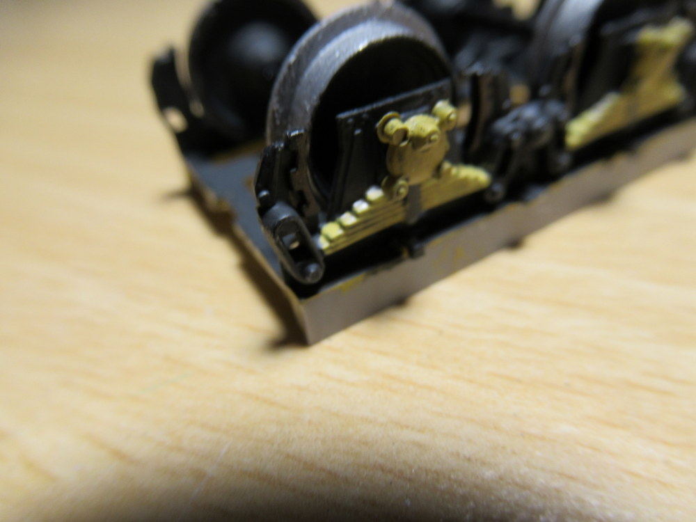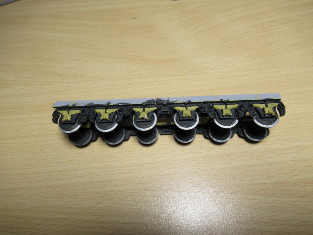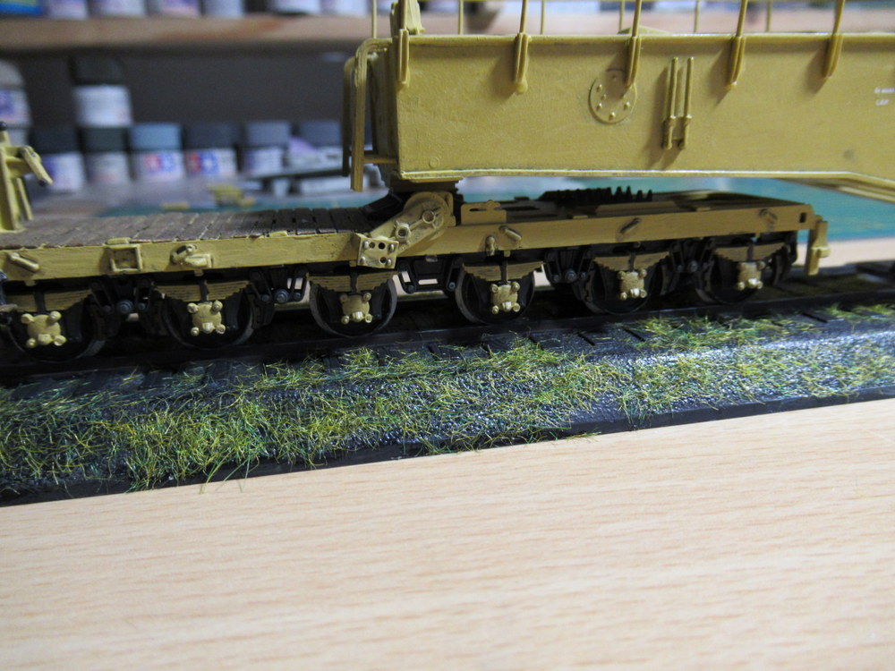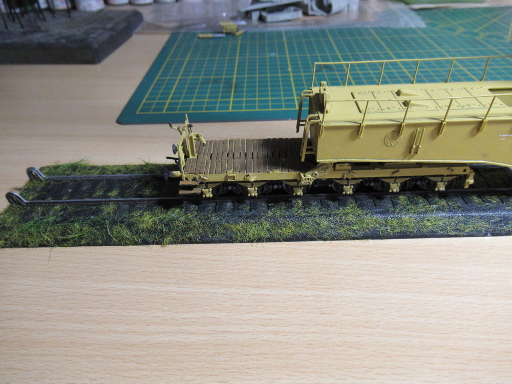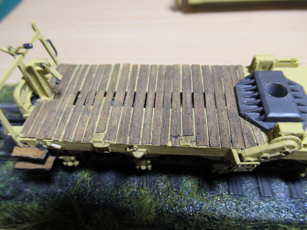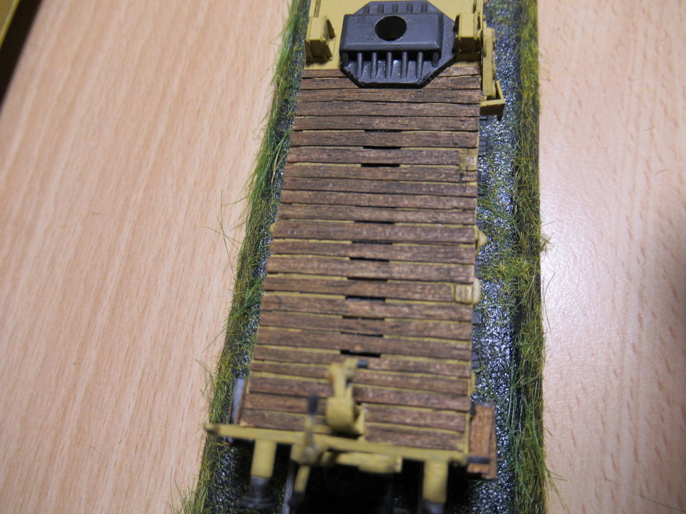 Die beiden Trägerwagons sollten jeweils angemalt werden , als wenn dort Holzplanken drauf wären . Das sah eher nach Essstäbchen aus . Und die Plastikvorgaben so zu bemalen als wenn es Holzbretter wären , war für mich nicht umsetzbar.