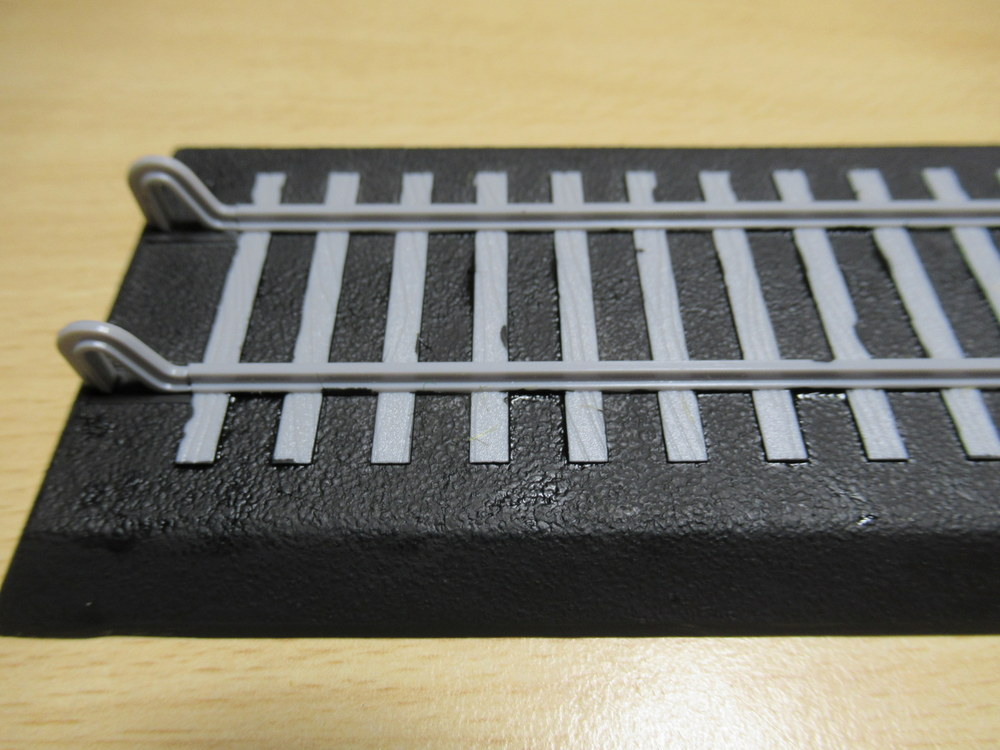 Als nächstes kommen die Gleise dran .Die Oberseite wie auch die Innenseite kommen in Eisenfarbe , da hier die Räder der Wagons laufen . Im Aussenbereich sind die Gleise meist dunkel Braun / Rostfarbig .