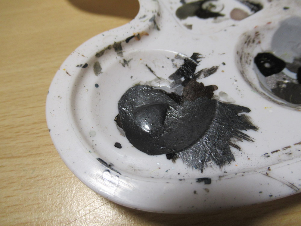 Einen nicht zu weichen Pinsel nur leicht an der Spitze benetzen . Ggf auch vorher leicht über ein Papier streichen , so das nur noch leichte Farbreste am Pinsel sind. Dann mit dem Pinsel leicht über das Rauhe Gestein wischen so das ein leichter Schimmer hängen bleibt . Wenn Du zuviel genommen hast ... einfach wieder Schwarz drüber .