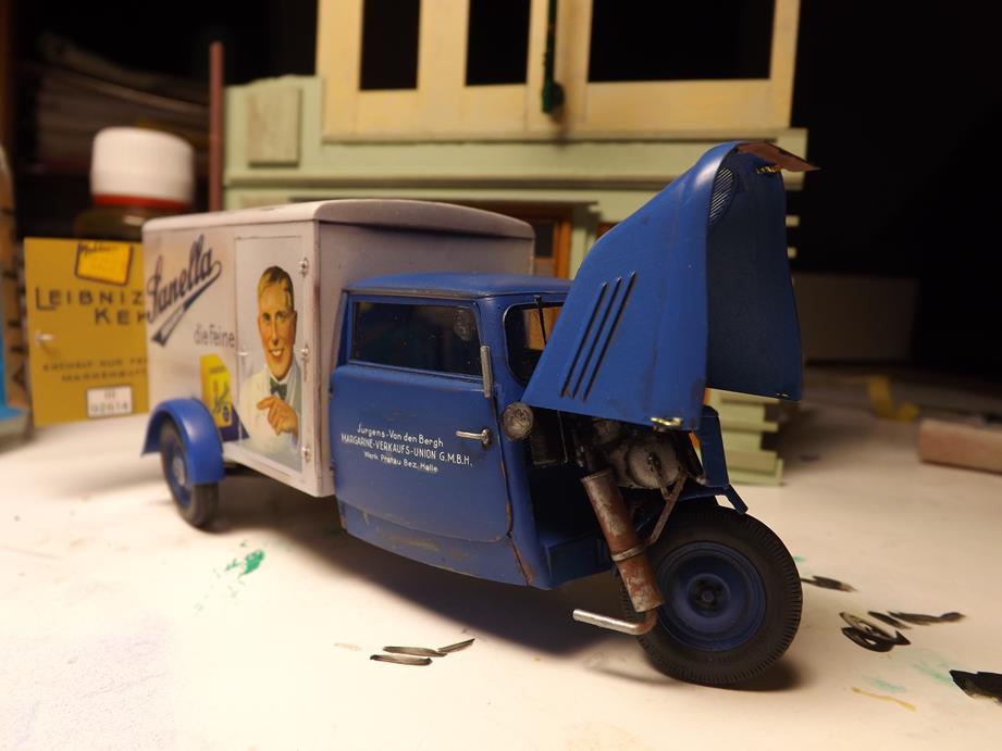 Im Gegensatz zur weiß/blauen Farbgebung des Sanella-Trucks gestaltete ich die hintere Türe als Austauschersatzteil. Hierzu lackierte ich diese in Butterkeks-Gelb und versah sie mit den Bahlsen-Decals der Keksversion des kleinen Dreirades. Ich dachte, das bringt etwas Farbe ins Modell. Die Türe stellte ich im Endeffekt geöffnet dar. Da ich die folgenden Bilder noch bearbeiten muss, ist für heute Ende Gelände.