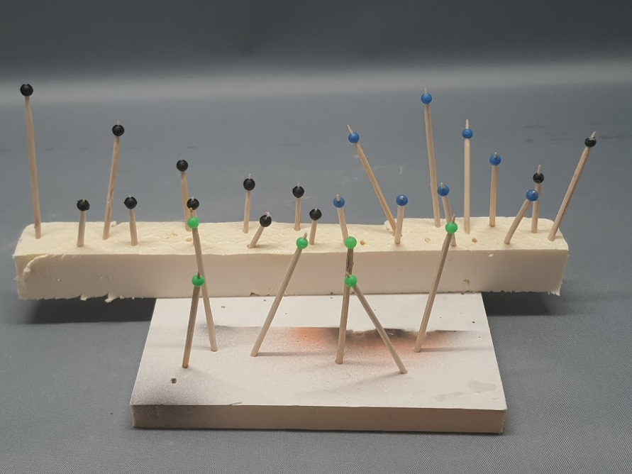 Mein bevorzugtes Material dafür ist geflochtene Angelschnur. Mittlerweile habe ich auch eine spezielle Schere dafür, die wirklich glatte Schnitte liefert. Das Fangnetz war ursprünglich ein Gemüsenetz, das allerdings fast die richtige Farbe hatte.