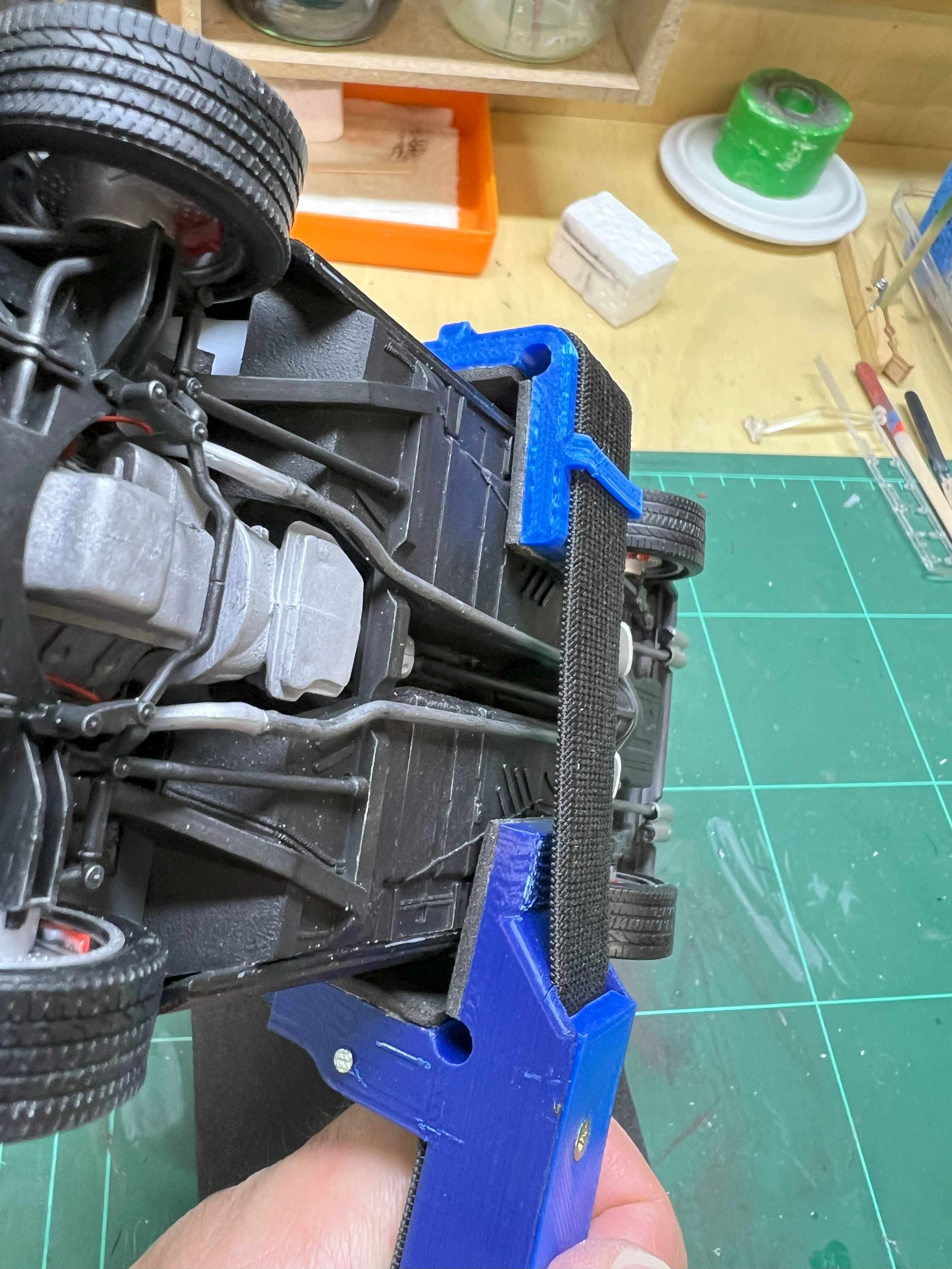 Beim Verkleben von Karosserie mit dem Unterboden im Automodellbau (oder artverwandten) ist es immer notwendig seitlich auf die Karosserie Druck auszuüben, um die Teile sauber zusammen zu bringen. Dafür habe ich oft kleine Zwingen benutzt oder auch Gummibänder.