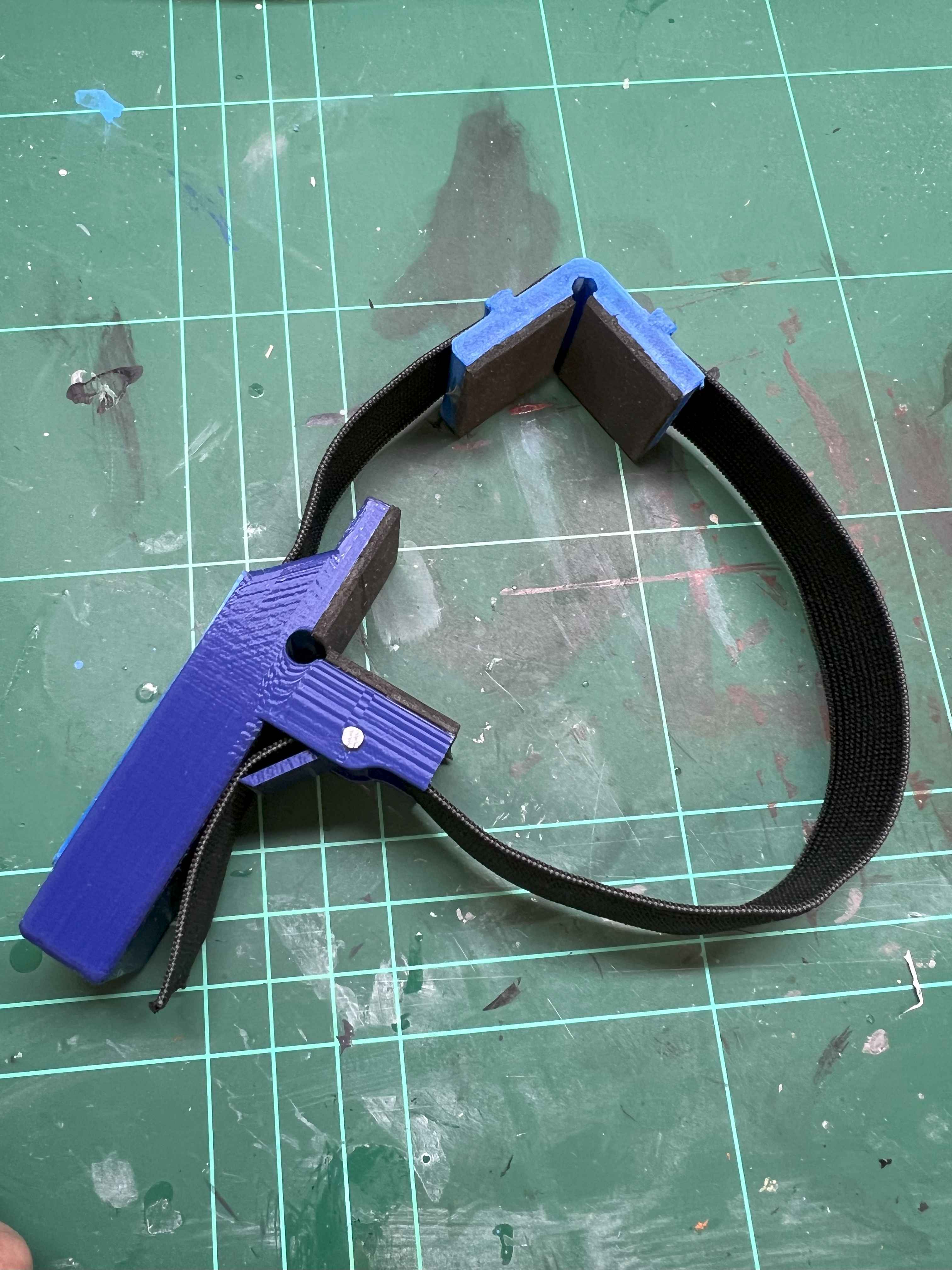 Meine Adaption sieht ein Handstück mit rechtem Winkel vor, an dem ein Gummiband mit einer Breite von 20mm befestigt ist. Auf dem Gummiband ist noch mal ein rechter Winkel flexibel verschiebbar befestigt. Das Gummiband wird wieder zurück auf das Handstückgeführt und kann durch über eine Klemmung fixiert werden, nachdem es mit dem gewünschten Druck festgezogen wurde.