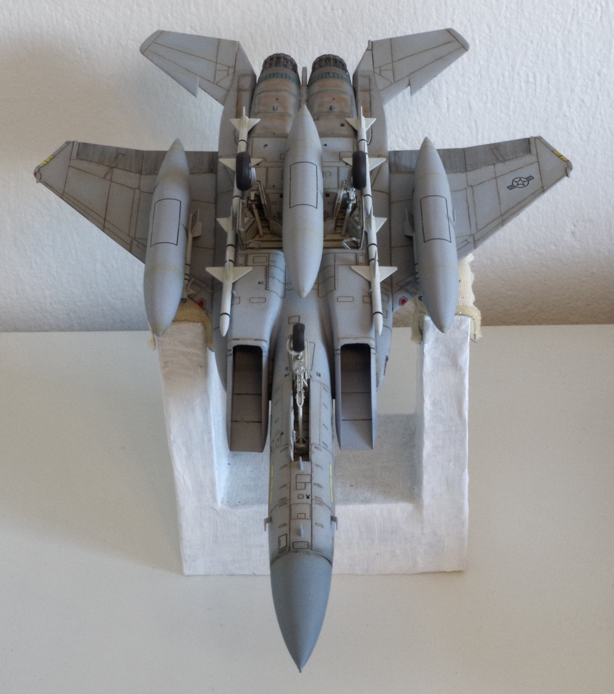 heute möchte ich euch meine McDonnel Douglas F-15 C Eagle von Tamiya in 1:48 zeigen. Mit dem Modell habe ich in mehrerer Hinsicht Neuland betreten. Es war mein erster Bausatz von Tamiya. Die überall gelobte unübertroffene Passgenauigkeit von Tamiya-Bausätzen kann ich hier allerdings nur eingeschränkt bestätigen. Beim Zusammenbau der unteren und oberen Rumpfhälfte passte es im Breich des Cockpits leider gar nicht, der obere Rumpfteil war deutlich breiter als der untere. Also viel Spachteln, Schleifen und Nachgravieren, was auf Grund der zahlreichen Klappen und Panellines eine kleine Herausforderung war. Aber unter Einsatz eines speziellen Klebebands von der Firma Dispiae (auch Neuland für mich) hat es gut geklappt.