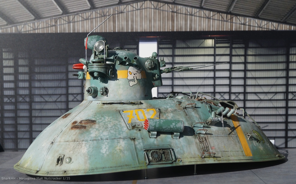 Gefällt mir sehr gut, besonders die 'ausgewaschenen' Farben, und sogar mit maßstabsgerechtem Hangar! Da bekommt man direkt Lust sich auch mal an sowas auszutoben. Aus reiner Neugier: wie sieht denn das Modell von unten aus, ist das innen hohl oder sind da irgendwelche Triebwerke o.Ä. drunter?