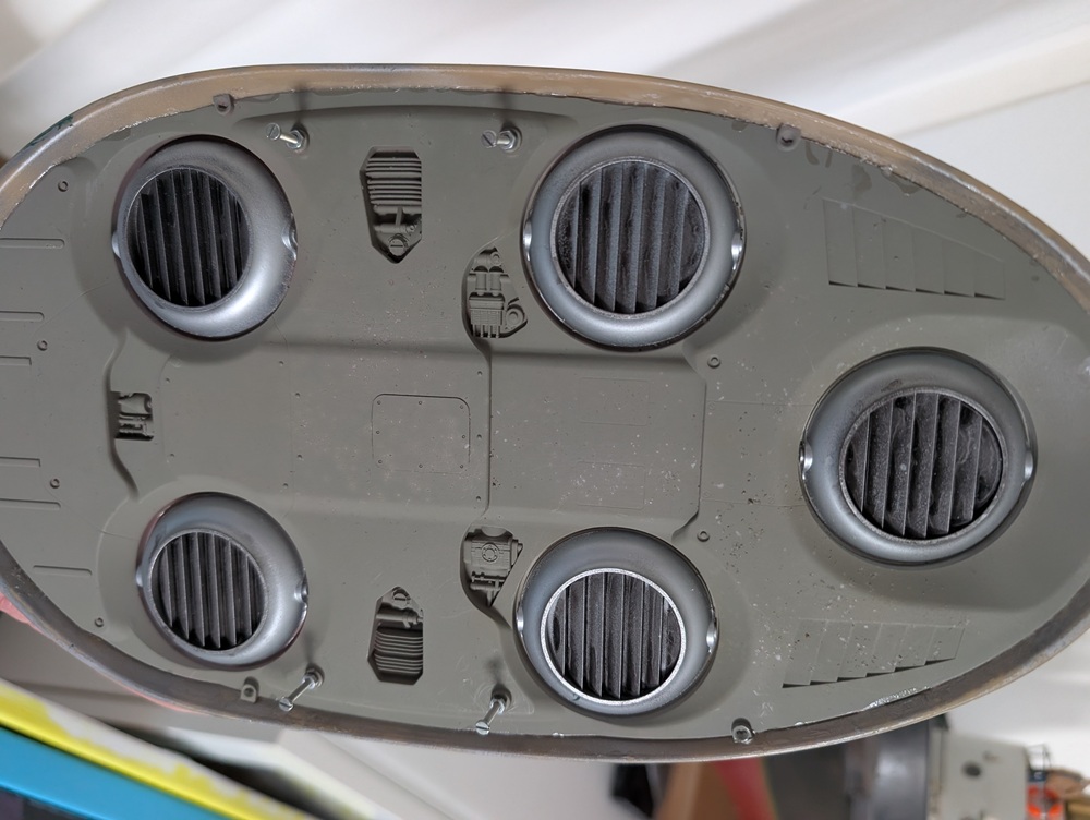 Und wer sich fragt, was die beiden Schrauben sollen. Es handelt sich ja um ein Fahrzeug, dass über den Boden schwebt. Damit das in einem möglichen Diorama besser passt, habe ich die Schrauben eingebaut, um das Schweben zu simulieren.