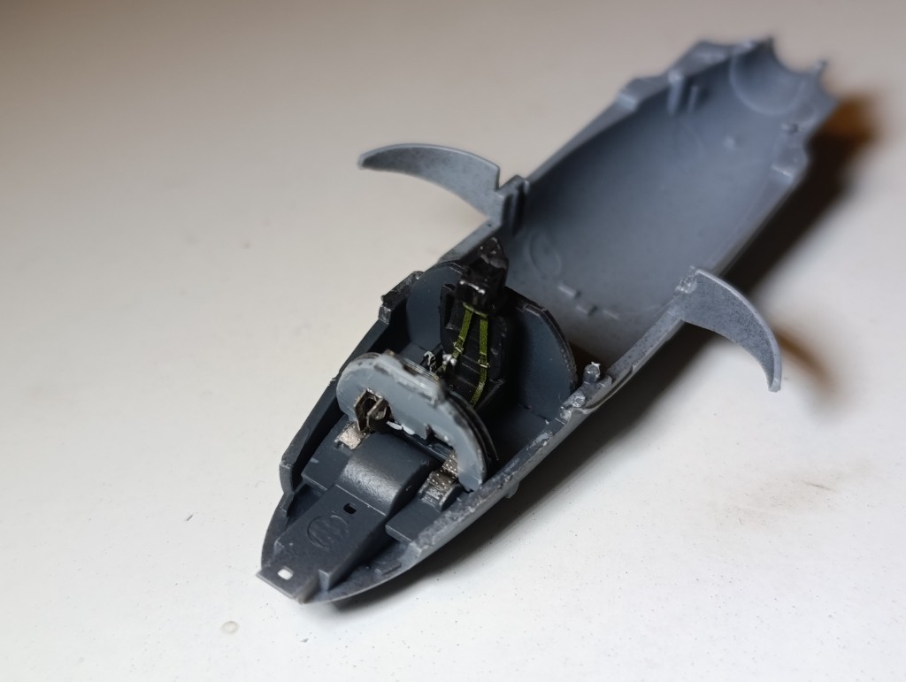 Das ganze ging in Cockpit los, dort war nicht viel zu machen, zumindest laut Bausatz. Denn es wurde nur der Cockpitboden, Rückwand, Sitz und Steuerknüppel eingesetzt. Schön ist dabei dass man auch die Modernisierung beachtet und einen alternativen Sitz beigelegt hat.dann habe ich das Innenleben dunkelgrau und den Sitz schwarz gesprüht.