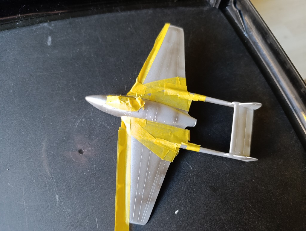 Dann habe ich das Flugzeug vollständig mit Metallfarben gesprüht. Nun ging die Abklebenorgie los und ich selbst hatte auch wirklich Respekt davor, da so eine Lackierung zwingend sauberes Arbeiten erfordert.